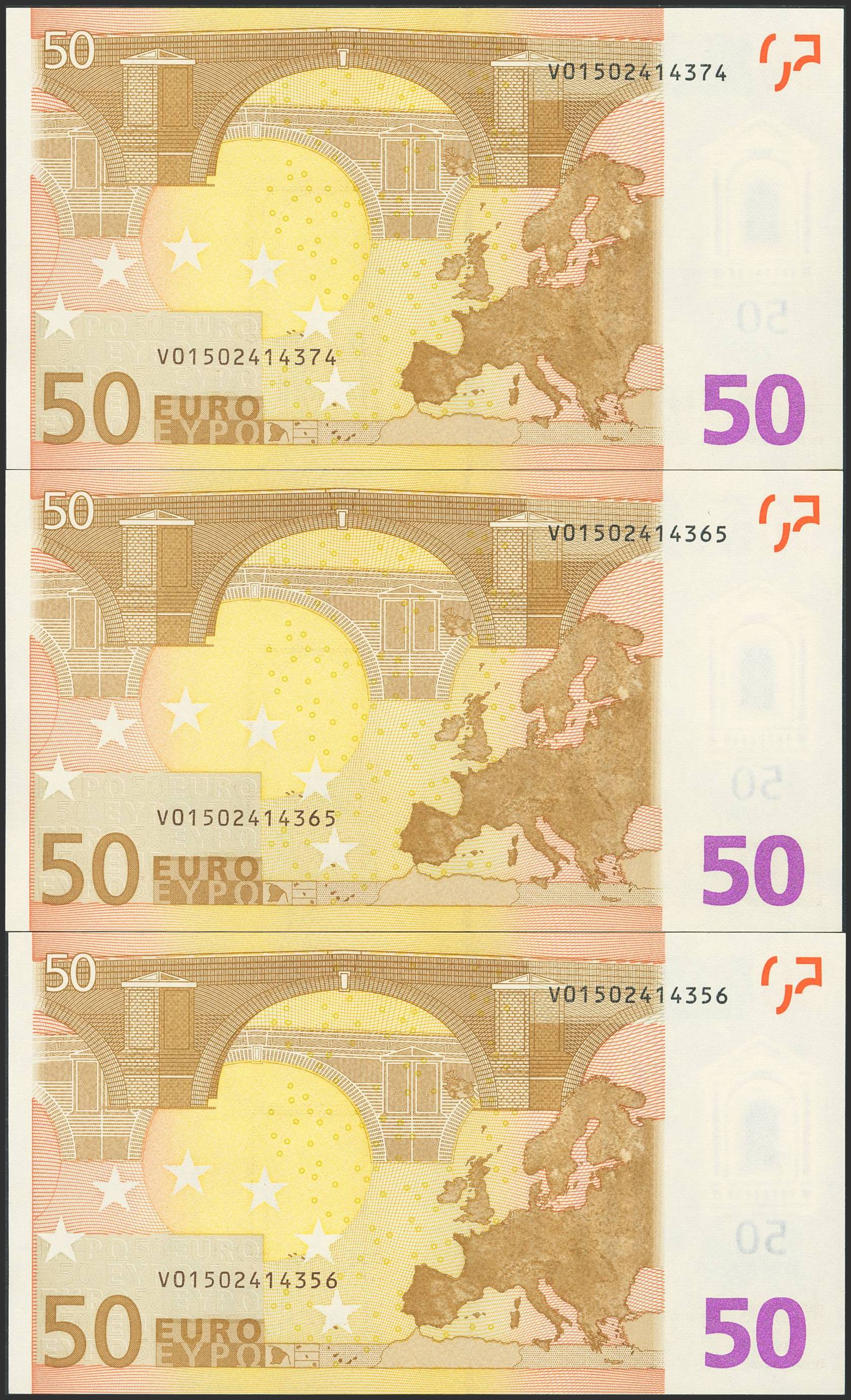 Conjunto de 3 billetes de 50 Euros todos ellos correlativos, emitidos el 1 de Enero de 2002, (cabe recordar que el último dígito de la numeración de todos los billetes denominados en euros es para control interno del Banco Central Europeo, el que marca la correlatividad de los billetes es el penúltimo dígito) con la Firma Duisenberg y la Serie V (España), (Edifil 2023: 489). SC.