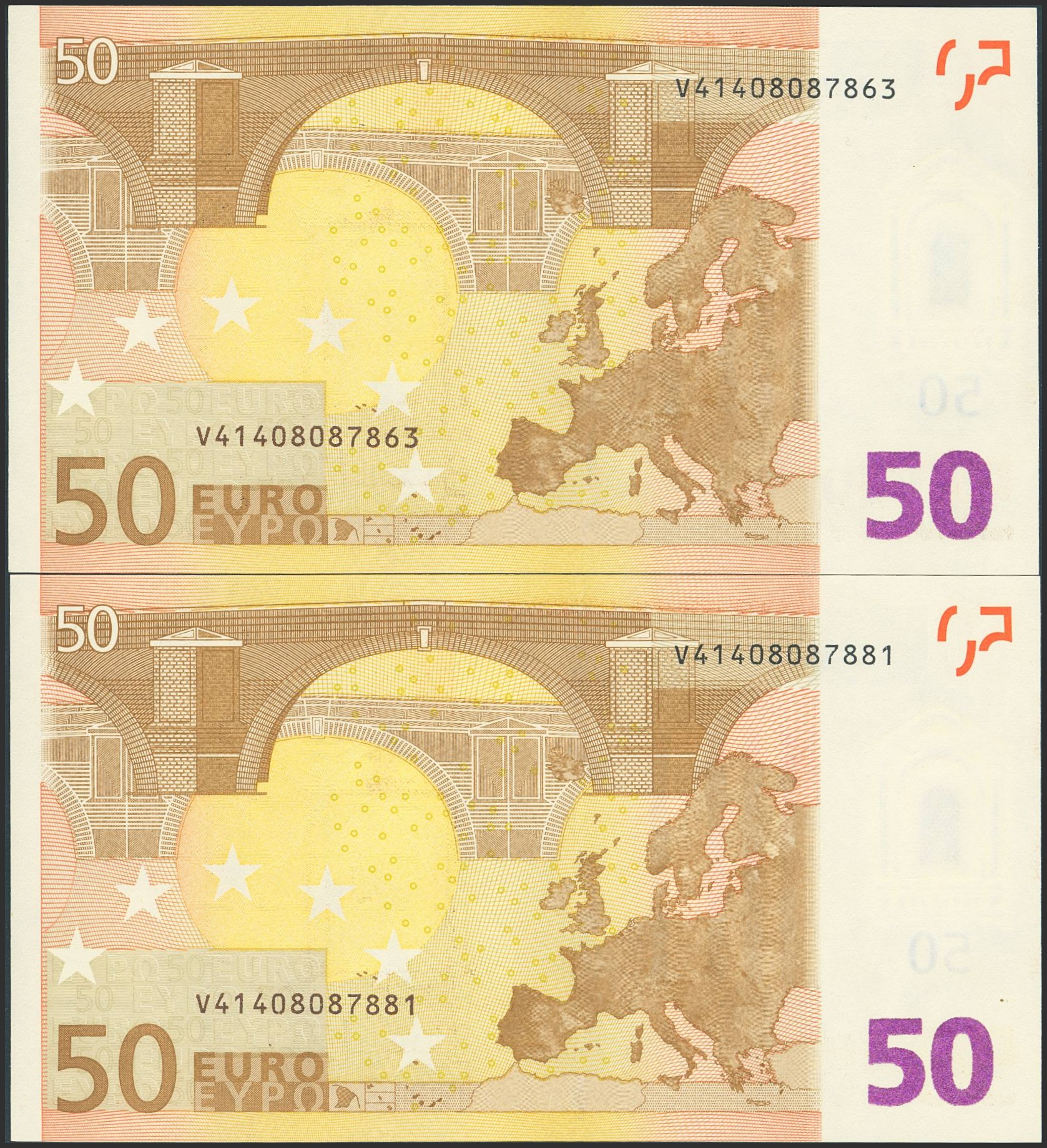 50 Euros. 1 de Enero de 2002. Pareja correlativa (cabe recordar que el último dígito de la numeración de todos los billetes denominados en euros es para control interno del Banco Central Europeo, el que marca la correlatividad de los billetes es el penúltimo dígito). Firma Trichet. Serie V (España). (Edifil 2023: 489A). SC.
