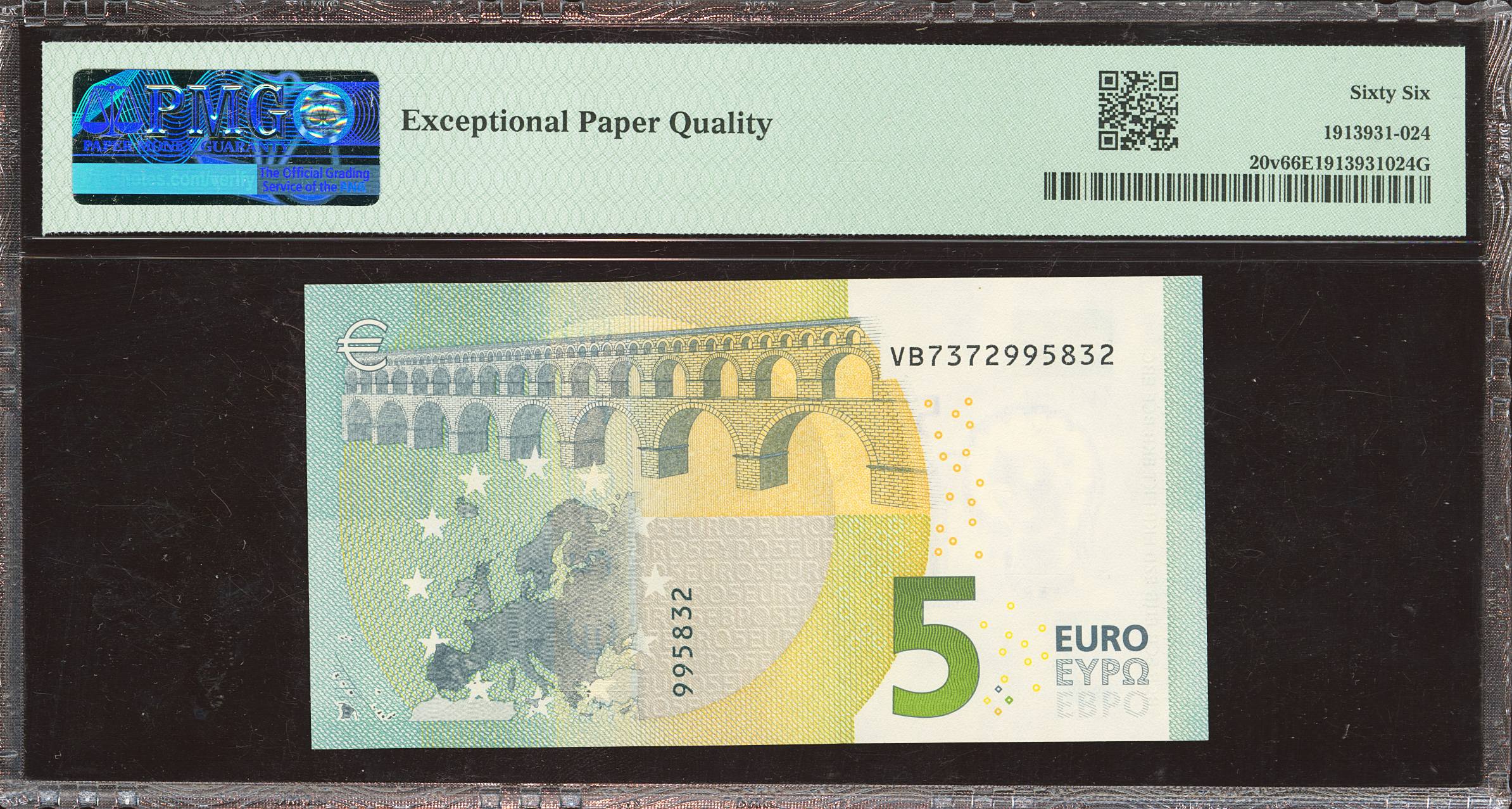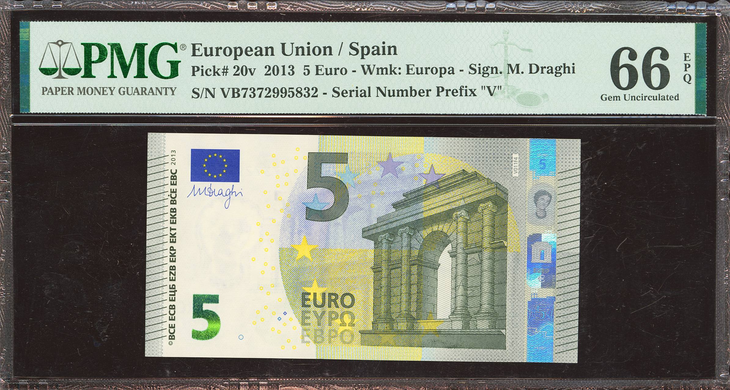 5 Euros. 2 de Mayo de 2013. Firma Draghi. Serie VB (España). (Edifil 2023: 493a, Pick: 20v). SC. Encapsulado PMG66EPQ.
