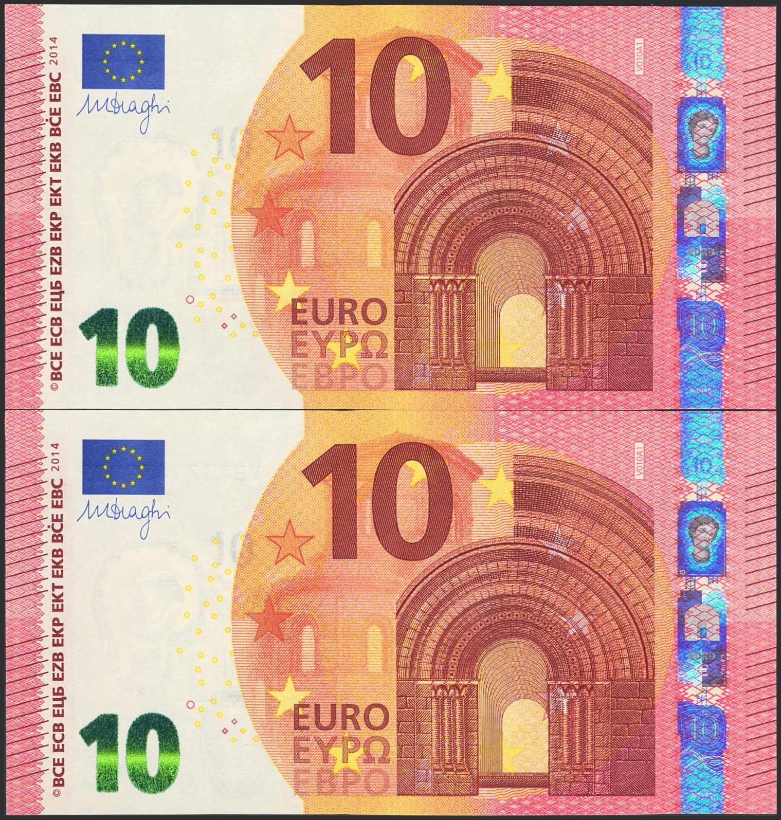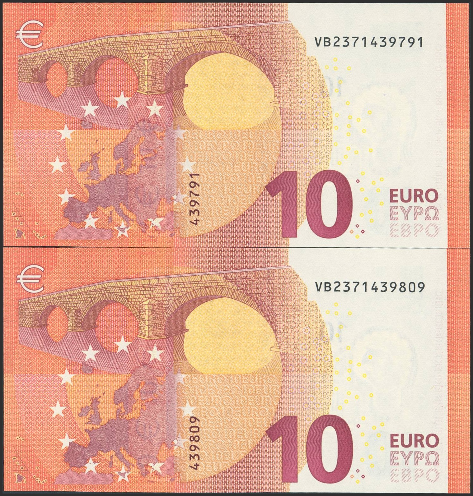 10 Euros. 23 de Septiembre de 2014. Pareja correlativa (cabe recordar que el último dígito de la numeración de todos los billetes denominados en euro es para el control interno del Banco Central Europeo, el que marca la correlatividad de los billetes es el penúltimo dígito). Firma Drahgi. Serie VB (España). (Edifil 2023: 494a, Pick: 21v). SC.