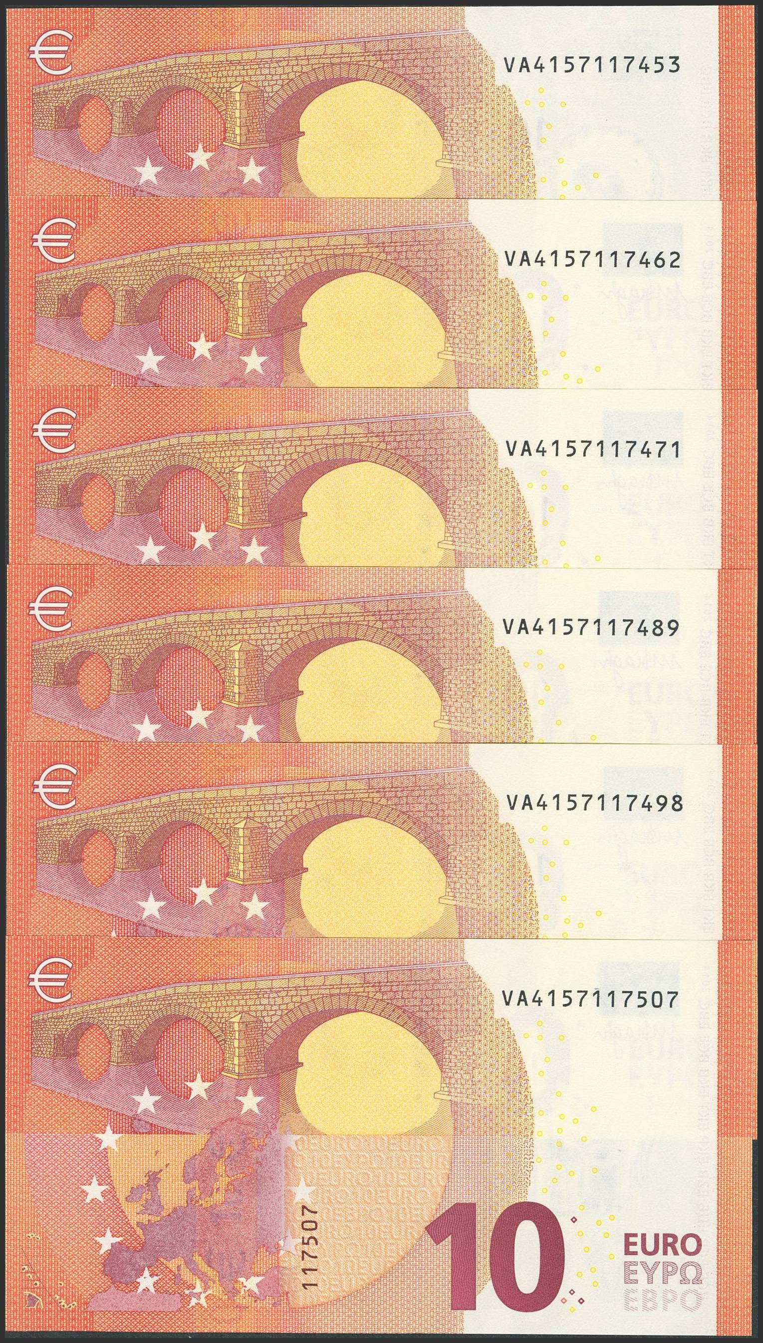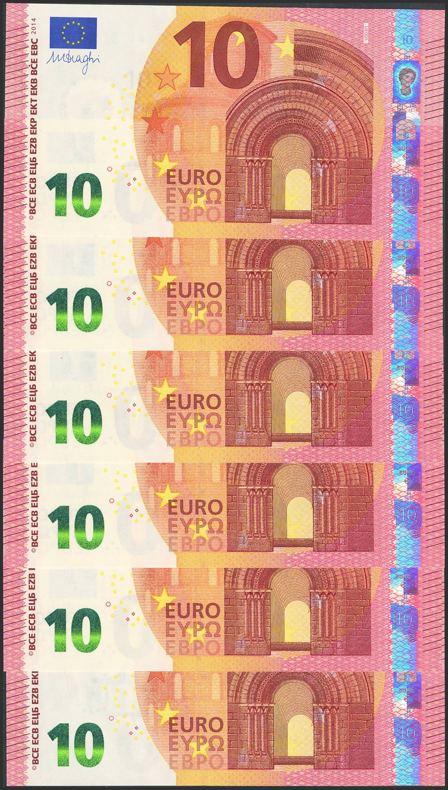 Conjunto de 6 billetes de 10 Euros todos ellos correlativos, emitidos en 2013 (cabe recordar que el último dígito de la numeración de todos los billetes denominados en euros es para control interno del Banco Central Europeo, el que marca la correlatividad de los billetes es el penúltimo dígito) con la Firma Draghi y la serie V (España). (Edifil 2023: 494). SC.