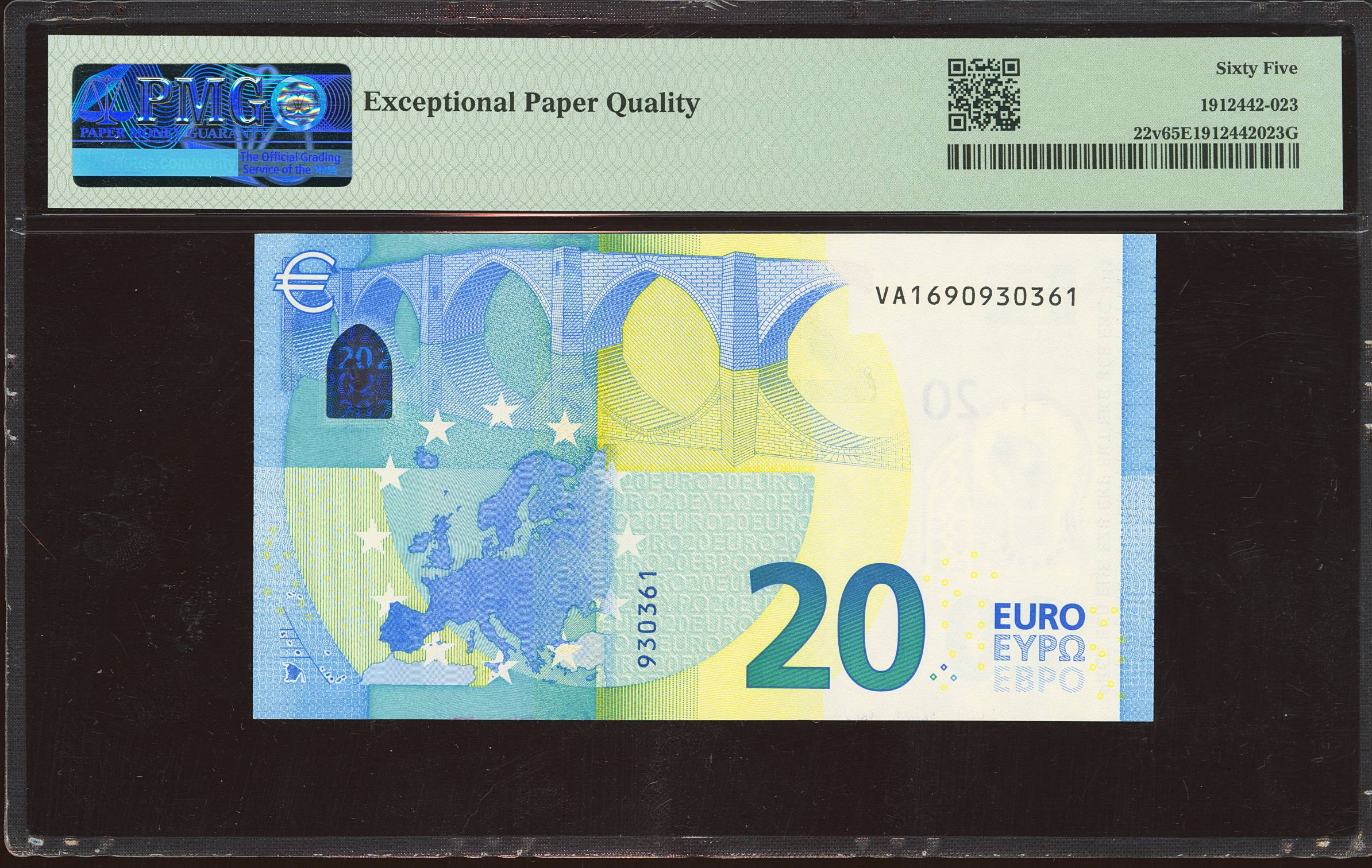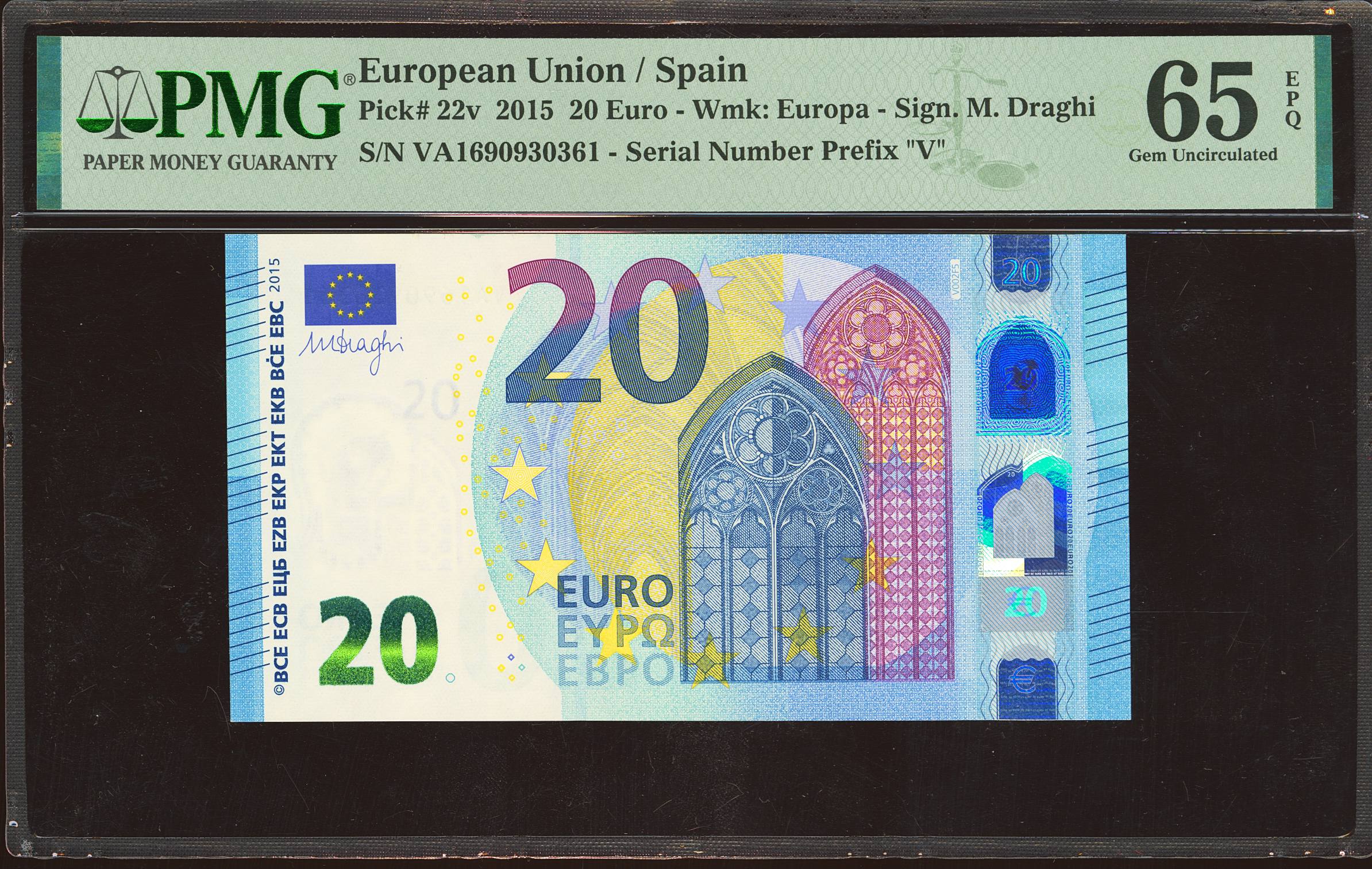 20 Euros. 25 de Noviembre de 2015. Firma Draghi. Serie V (España). (Edifil 2023: 495, Pick: 22v). SC. Encapsulado PMG65EPQ.