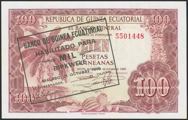 GUINEA ECUATORIAL. 1000 Bipkwele sobre 100 Pesetas Guineanas. 1 de Diciembre de 1969. (Pick: 18). Apresto original. SC-.