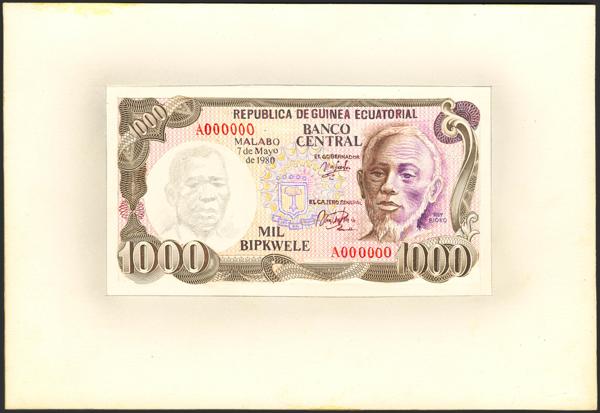 GUINEA ECUATORIAL. 1000 Pesetas. 7 de Mayo de 1980. Prueba de artista del Banco de Guinea de un billete que no llego a ponerse en circulación y elaborada desde el punto de vista artístico artesanalmente, sobre cartulina. Rarísima y espectacular. SC-.
