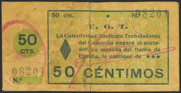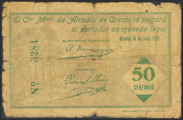 ALCUDIA DE CRESPINS (VALENCIA). 50 Céntimos. 16 de Julio de 1937. (Pick: 409). Raro. BC-.