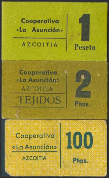 AZCOITIA . 1 Peseta, 2 Pesetas y 100 Pesetas. (1937ca). EBC/SC--.