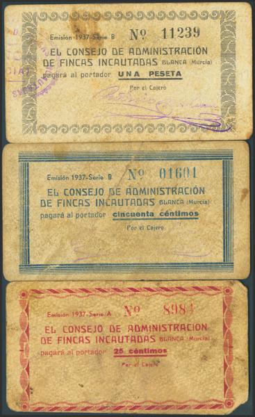 BLANCA (MURCIA). 25 Céntimos, 50 Céntimos y 1 Peseta. 1937. Series A, B, B, respectivamente. (Pick: 1231, 1232, 1233). Raros. MBC+.