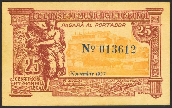 BUÑOL (VALENCIA). 25 Céntimos. Noviembre de 1937. (González: 1324). Inusual. SC-.