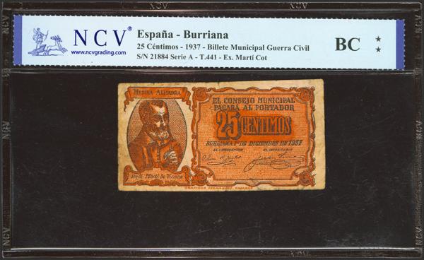 BURRIANA (CASTELLON). 25 Céntimos. 1 de Diciembre de 1937. (González: 1335). Inusual. Encapsulado NCV (BC).