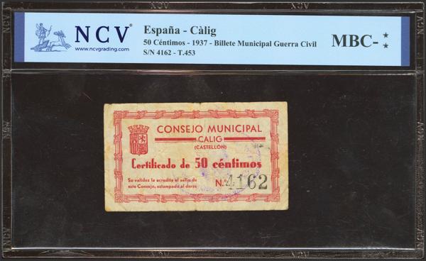 CALIG (CASTELLON). 50 Céntimos. (1937ca): (González: 1408). Raro. Encapsulado NCV (MBC-).