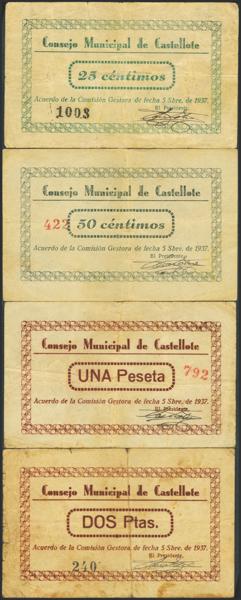 CASTELLOTE (TERUEL). 25 Céntimos, 50 Céntimos, 1 Peseta y 2 Pesetas. 5 de Septiembre de 1937. (González: 1791/94). Rara serie completa. MBC.