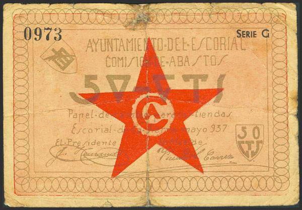 EL ESCORIAL (MADRID). 50 Céntimos. Mayo de 1937. (González: 2323). Raro, reparado. BC.