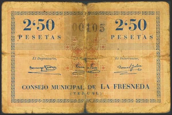 FRESNEDA (TERUEL). 2´50 Pesetas. (1937ca). (Pick: 2534). Rarísimos, presencia de cinta adhesiva RC.