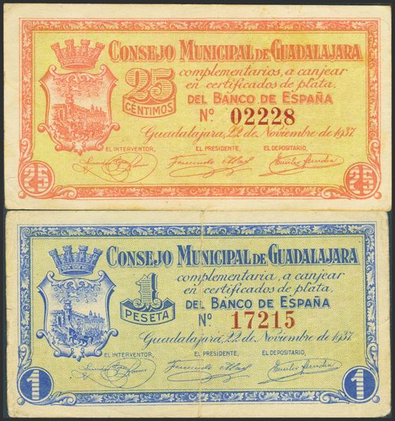GUADALAJARA. 25 Céntimos y 1 Peseta. 22 de Noviembre de 1937. (González: 2748, 2750). Inusuales. EBC-/MBC.