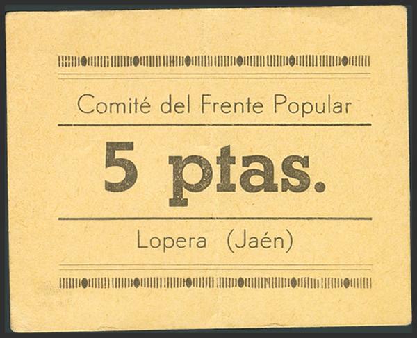 LOPERA (JAEN). 5 Pesetas. (1937ca). (González: 3222). Raro. EBC-.
