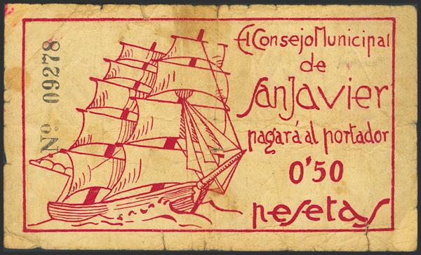 SAN JAVIER (MURCIA). 50 Céntimos. (1937ca). Serie B. (González: 4680). Inusual. MBC-.