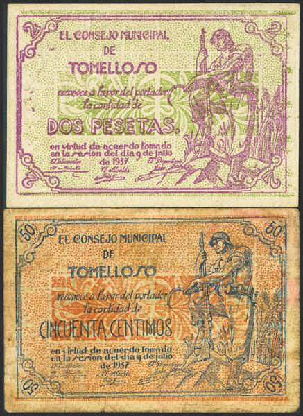TOMELLOSO (CIUDAD REAL). 50 Céntimos y 2 Pesetas. 9 de Julio de 1937. (González: 5043, 5045). MBC/SC-.