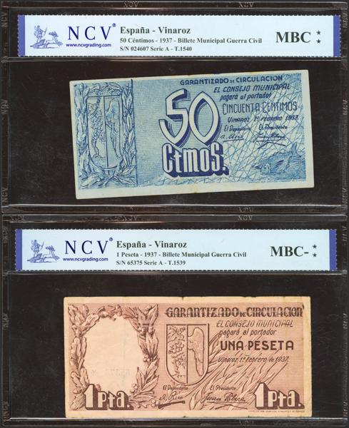 VINAROZ (CASTELLON). 50 Céntimos y 1 Peseta. 1 de Febrero de 1937. Serie A, ambos. (González: 5774/75). Serie completa. Encapsulado NCV (MBC/MBC-).