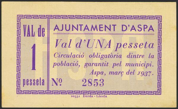 ASPA (LERIDA). 1 Peseta. Marzo de 1937. (Pick: 6440). Raro. SC--.