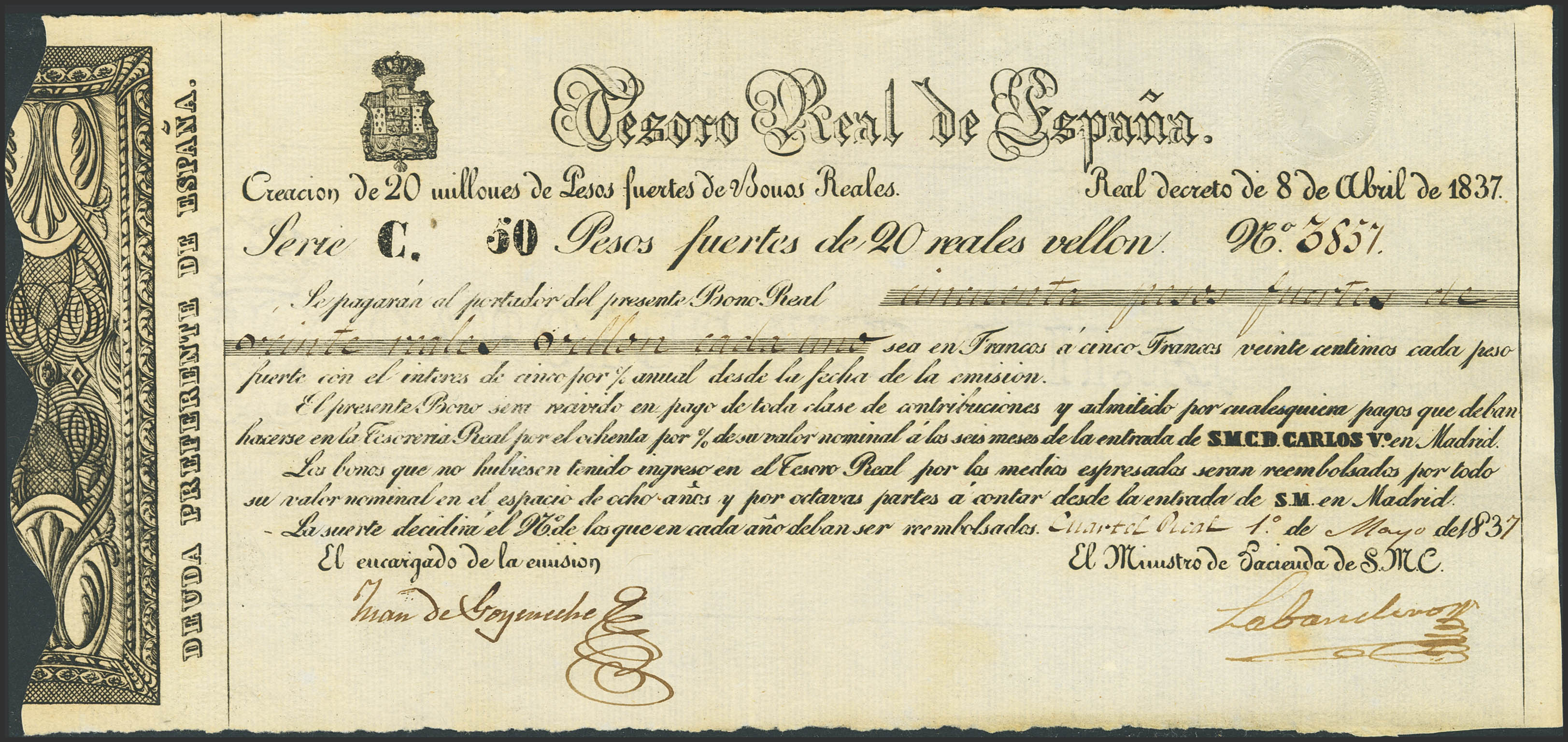 50 Pesos Fuertes de 20 Reales de Vellón. Tesoro Real de España. 8 de Abril de 1837. Serie B. (Edifil 2023: 21). Raro, especialmente en esta excepcional calidad. SC-.
