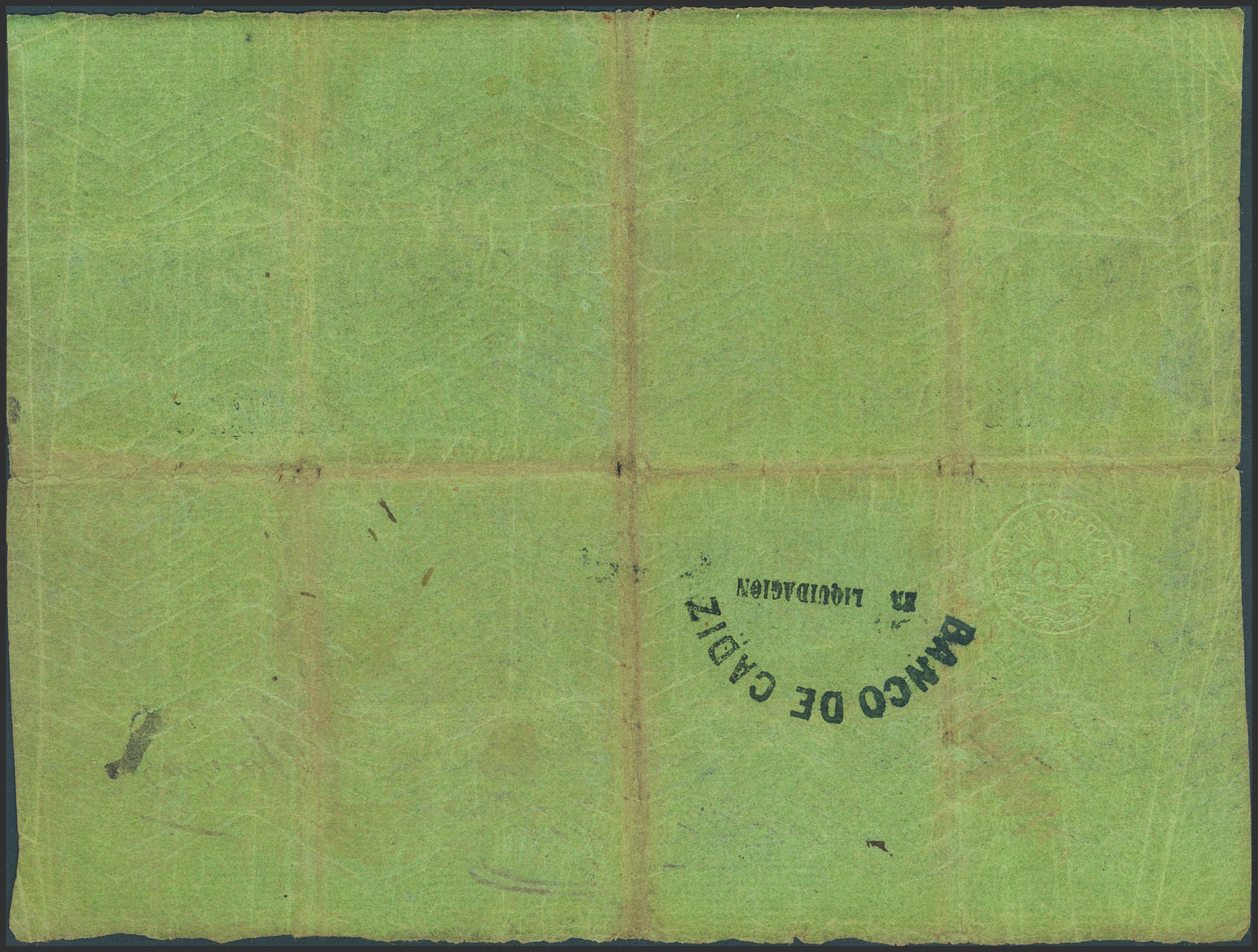 BANCO DE CADIZ. Emisión II. 100 Reales. 1 de Abril 1864 (fechado a mano). Cuatro firmas y resello en seco. (Edifil 2023: 76). Muy raro y habituales erosiones que acompañan a los dobleces. MBC+.
