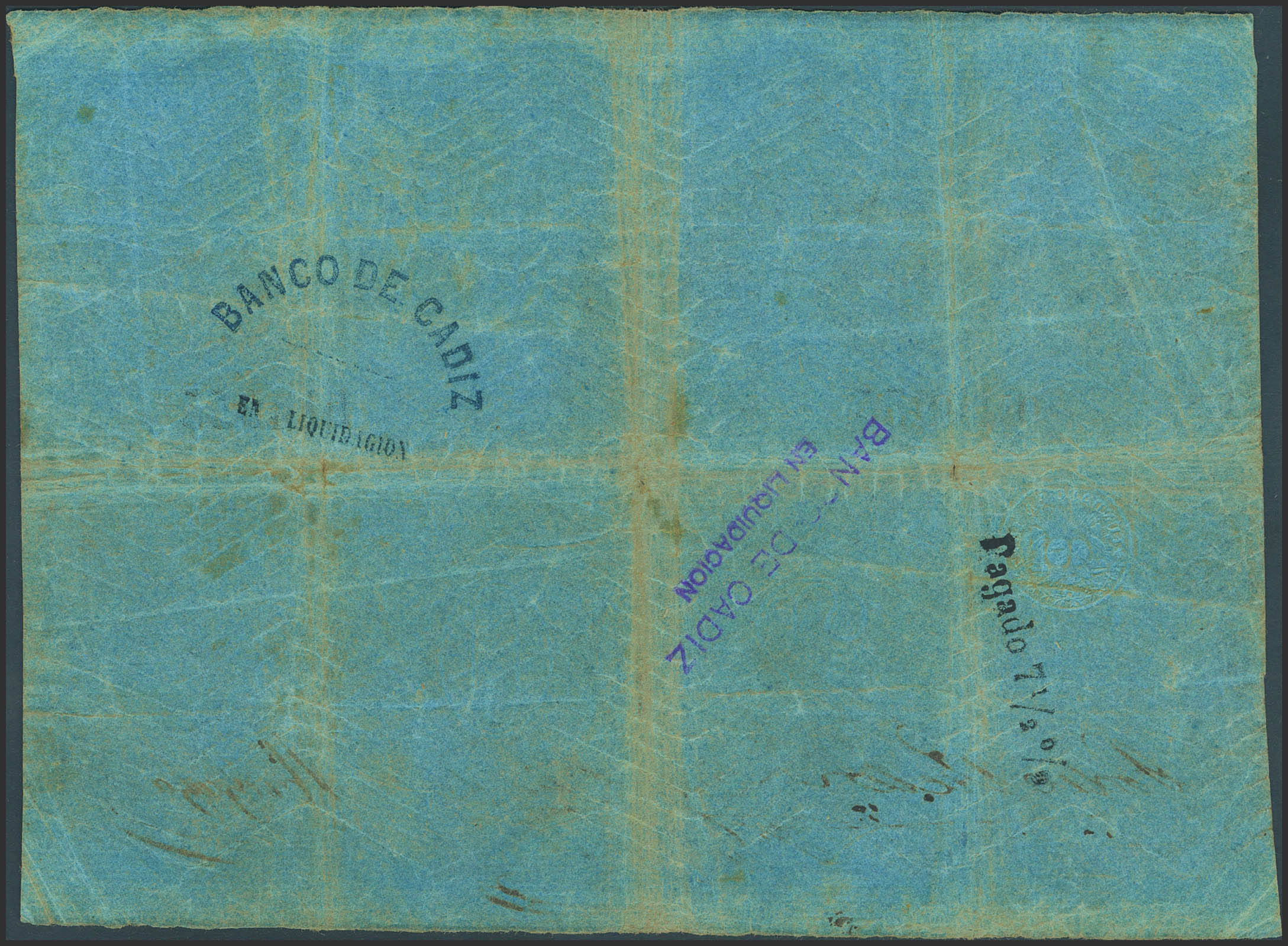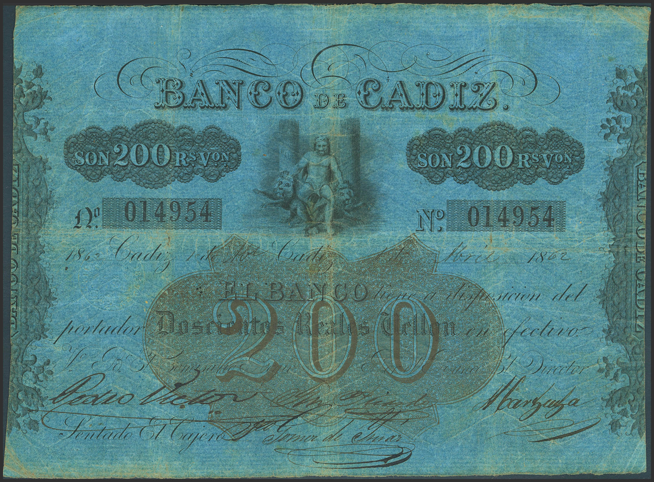 BANCO DE CADIZ. Emisión II. 200 Reales. 1 de Abril 1862 (fechado a mano). Cuatro firmas y resello en seco. (Edifil 2023: 77). Muy raro y habituales erosiones que acompañan a los dobleces. MBC+.