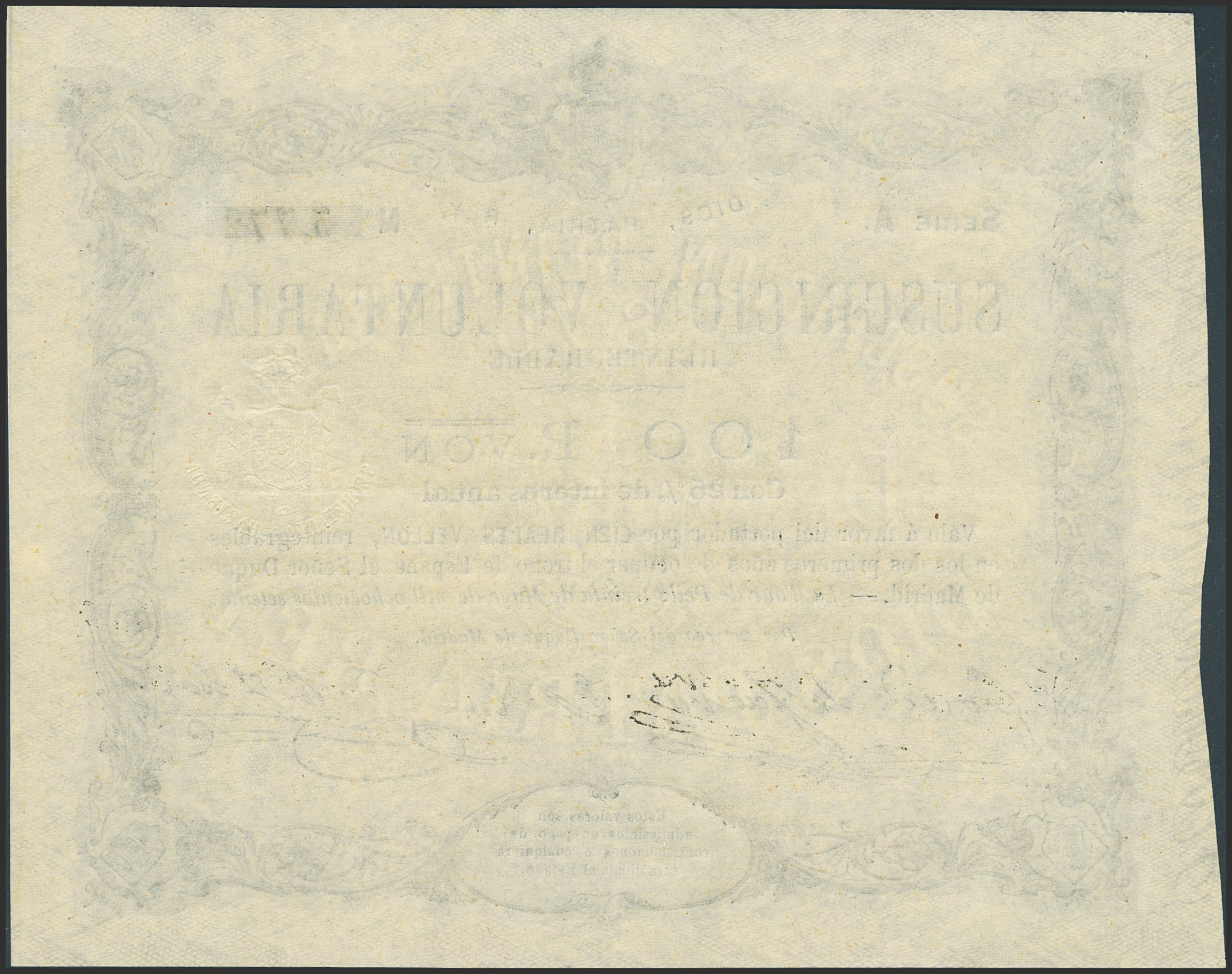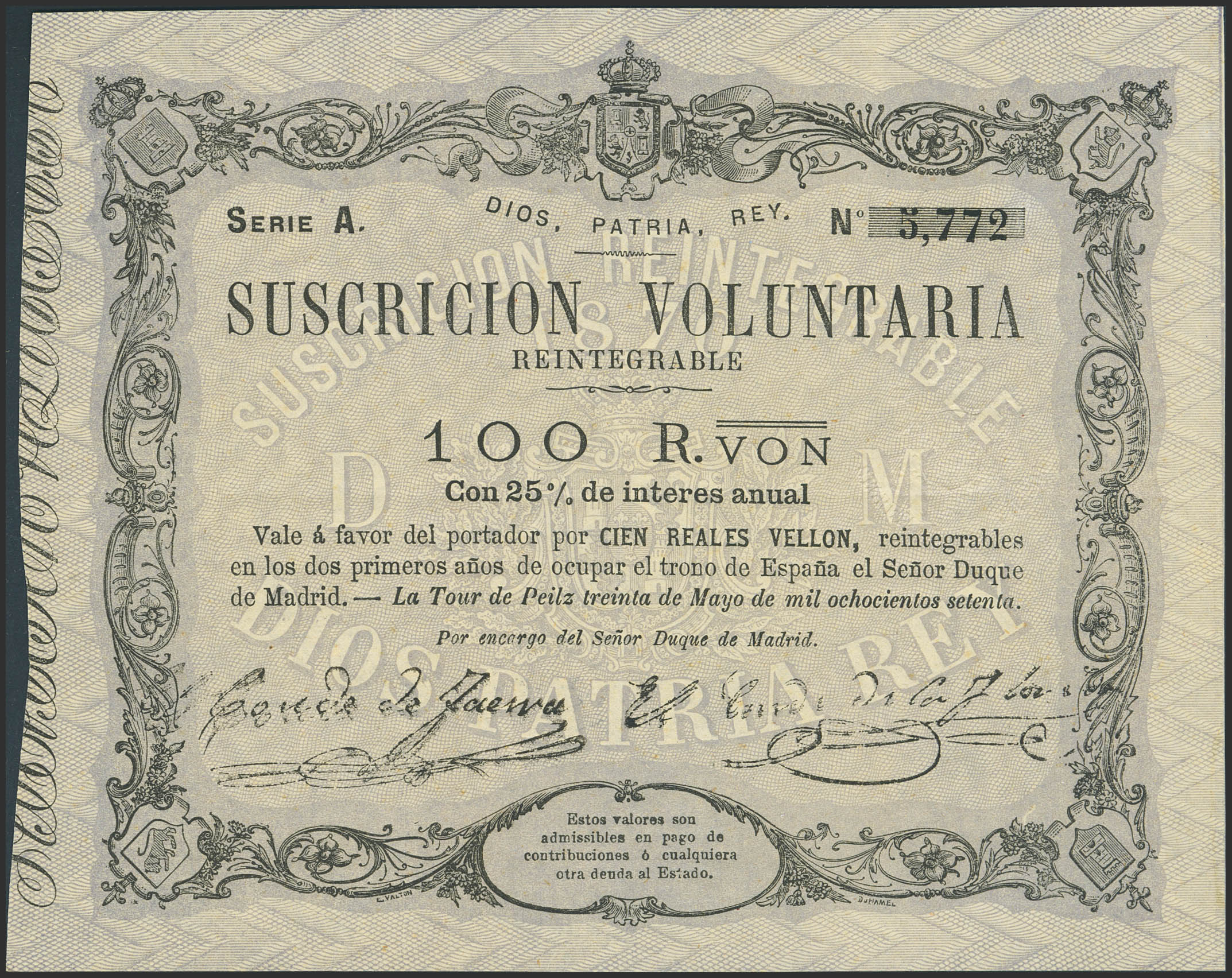 100 Reales de Vellón. 30 de Mayo de 1870. Emisión de Tour de Peilz. Serie A. (Edifil 2023: 196). MBC+.