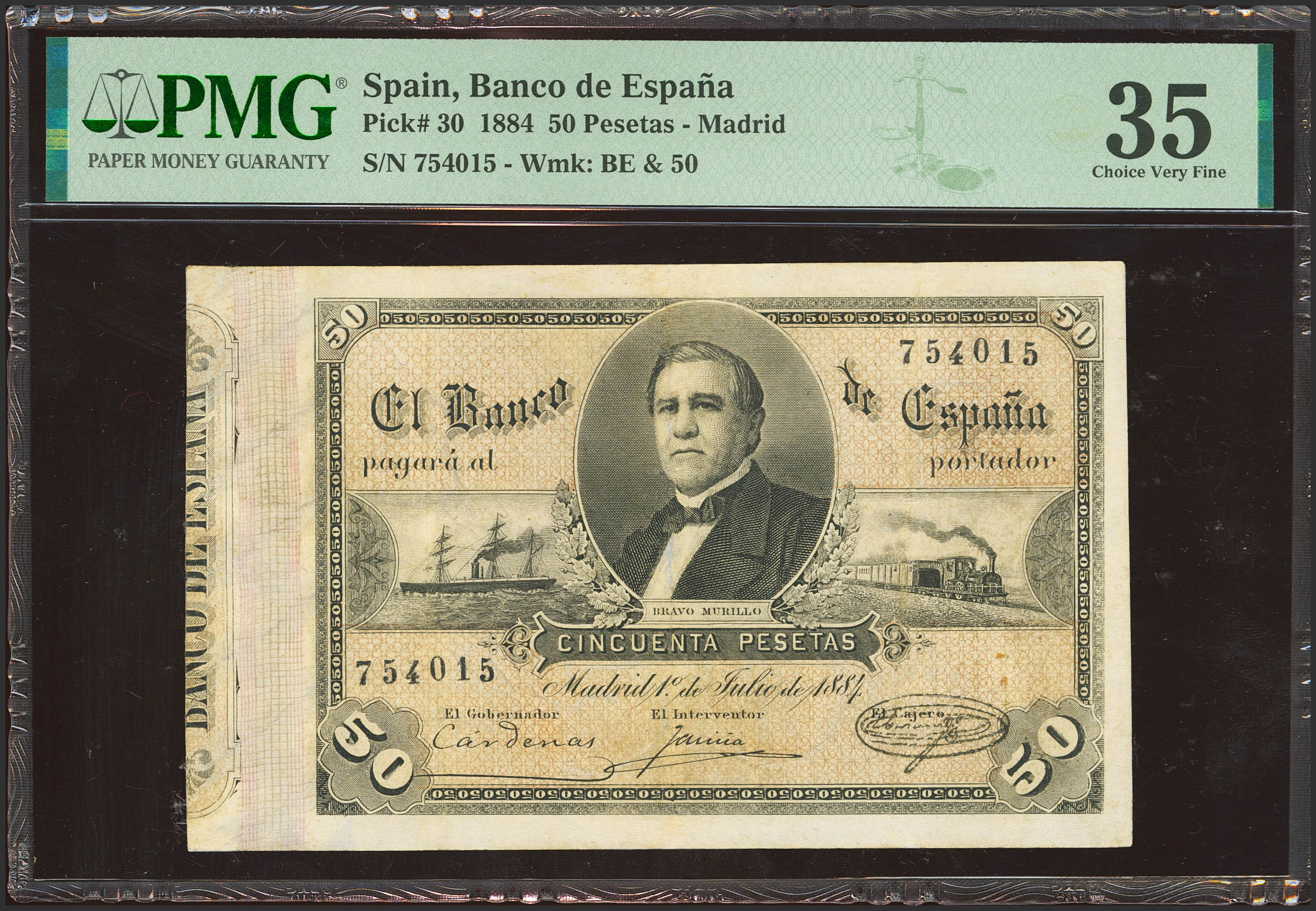50 Pesetas. 1 de Julio de 1884. Sin serie. (Edifil 2023: 288, Pick: 30). Raro, reparado. MBC+. Encapsulado PMG35 (repaired).