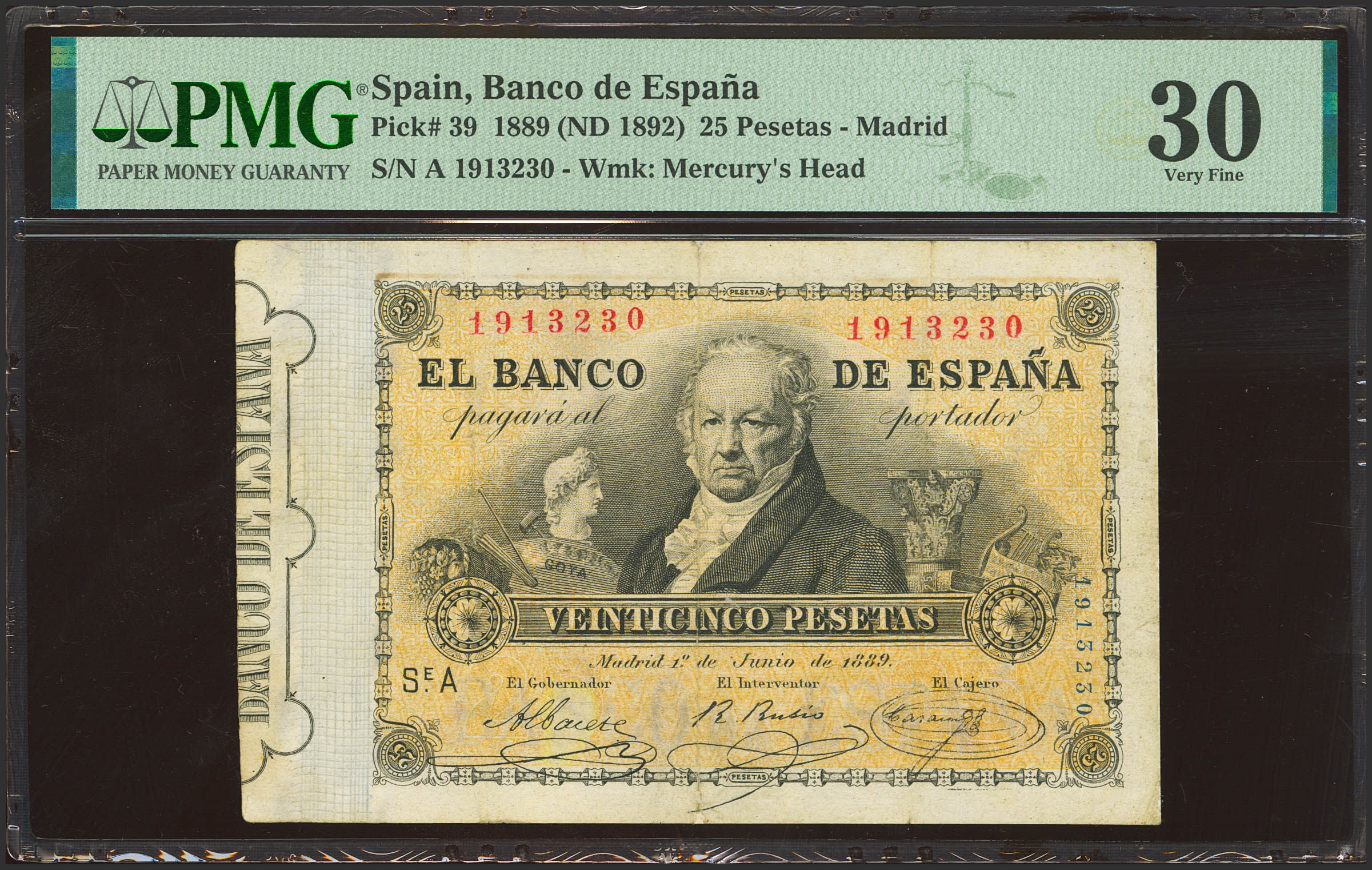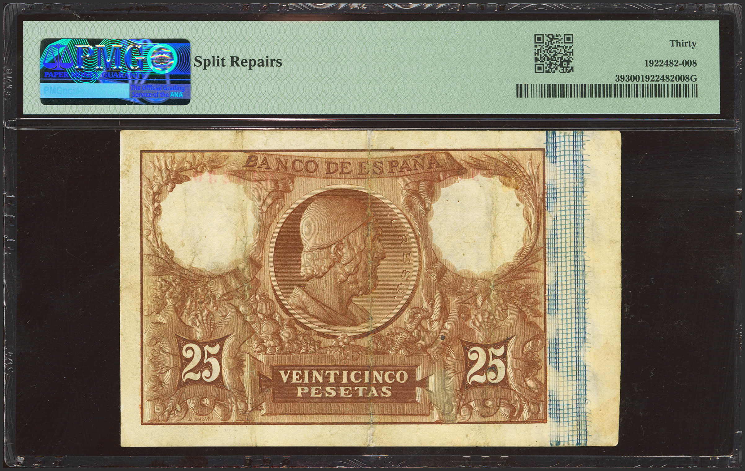25 Pesetas. 1 de Junio de 1889. Serie A. (Edifil 2023: 297, Pick: 39). Raro, mínimamente reparado. MBC+. Encapsulado PMG30 (split repairs).