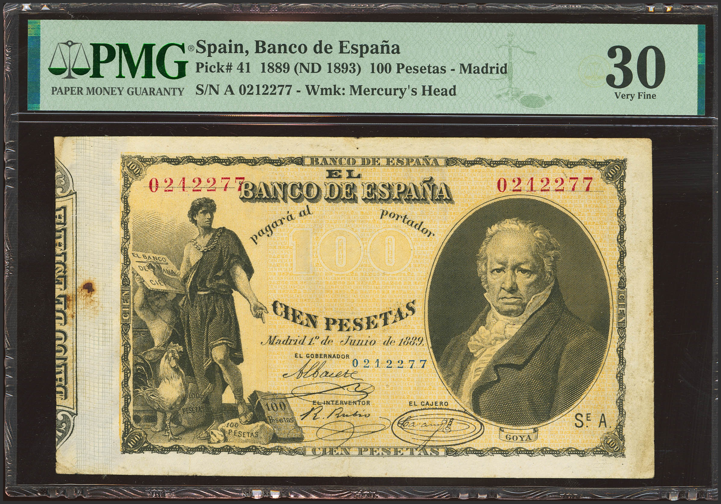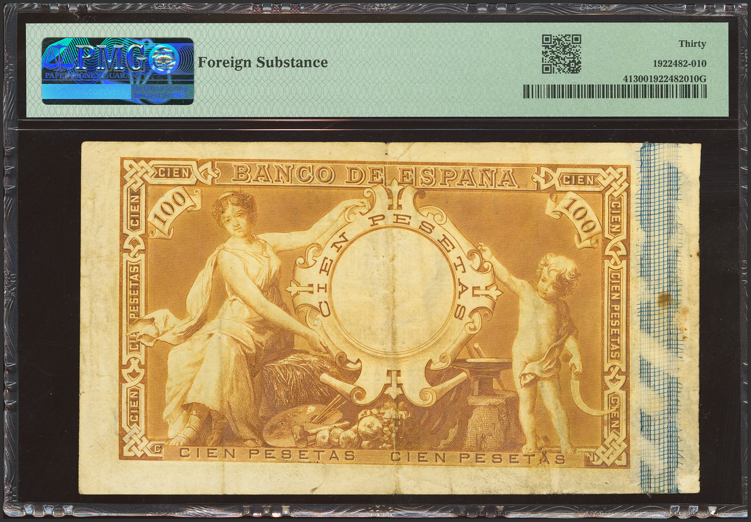 100 Pesetas. 1 de Junio de 1889. Serie A. (Edifil 2023: 299, Pick: 41). Muy raro, especialmente sin reparaciones. MBC+. Encapsulado PMG35 (foreign substance).