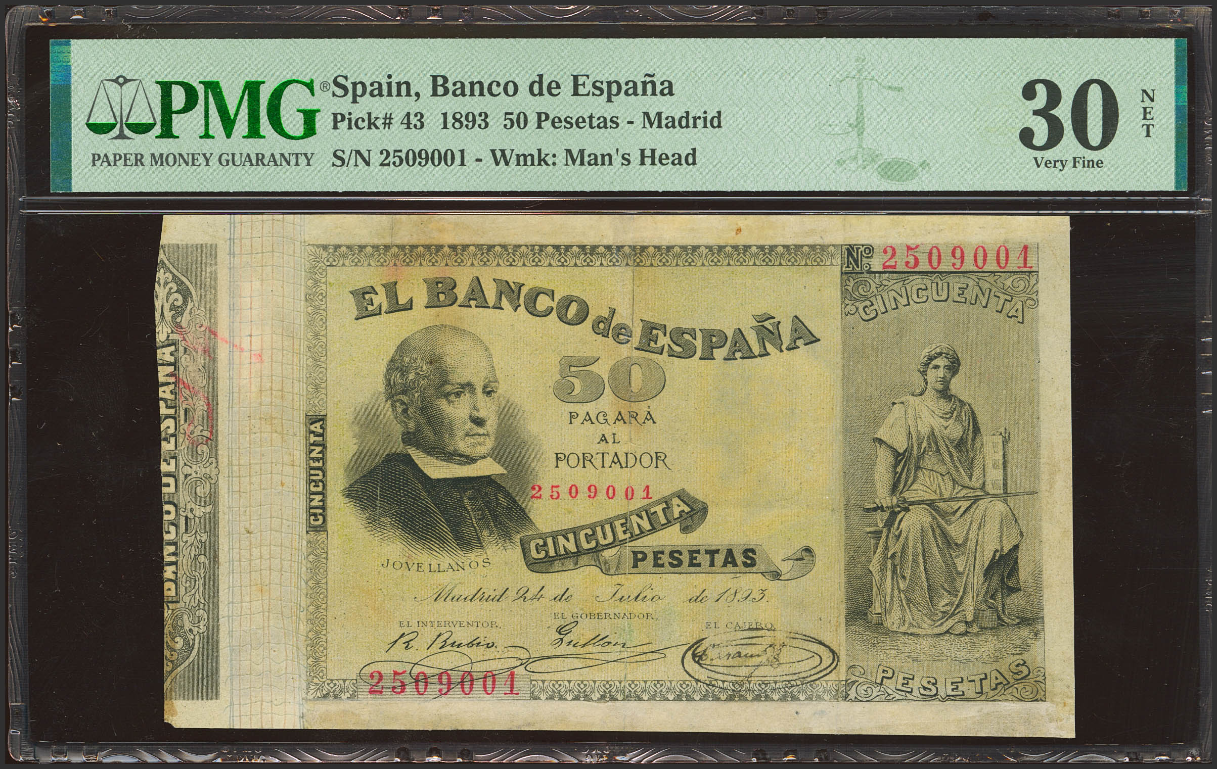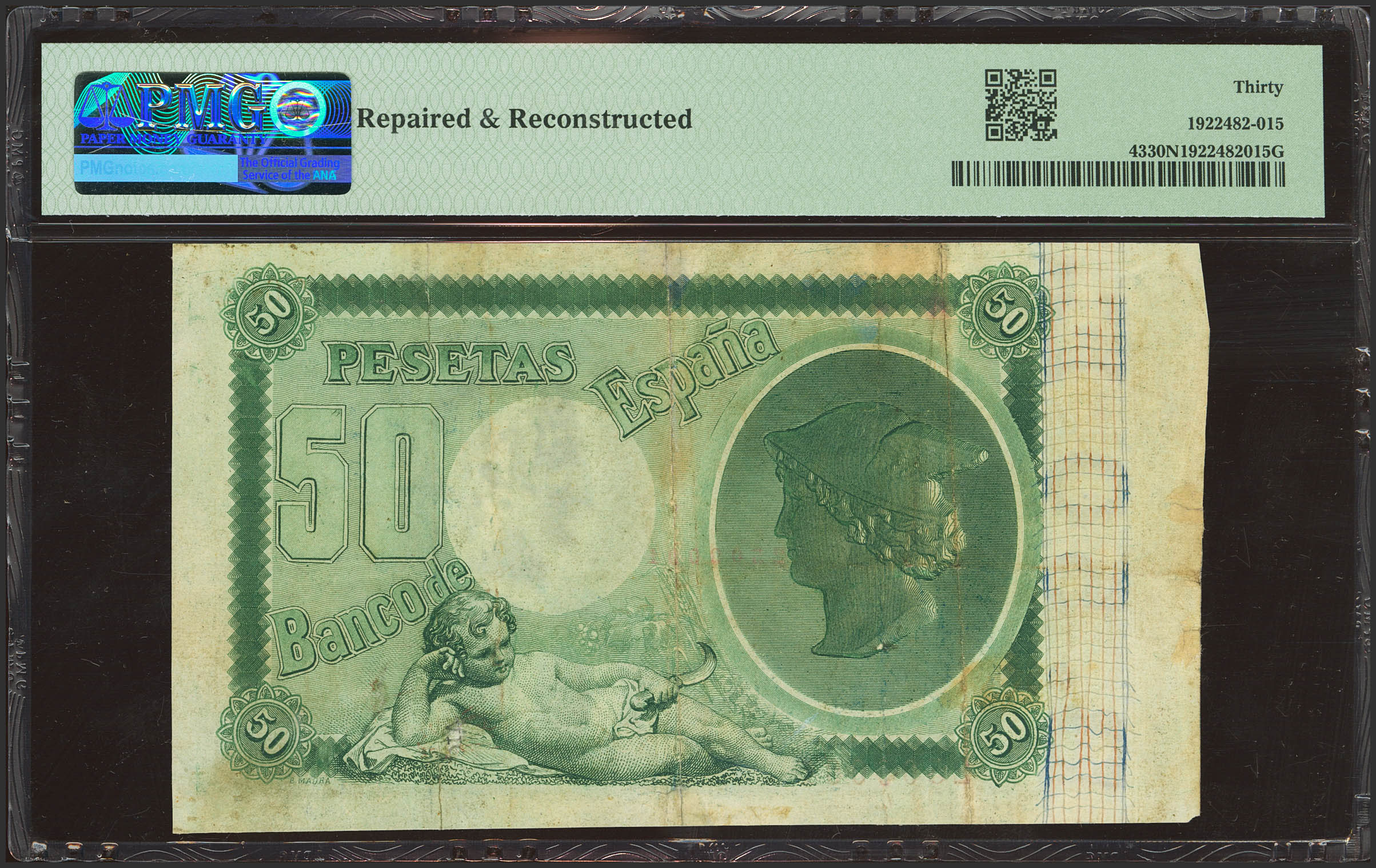 50 Pesetas. 24 de Julio de 1893. Sin serie. (Edifil 2023: 301, Pick 43). Raro, reparado. MBC+. Encapsulado PMG30NET (repaired and reconstructed).