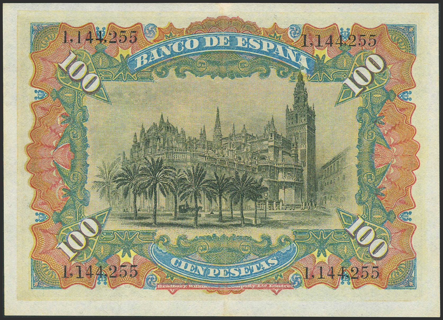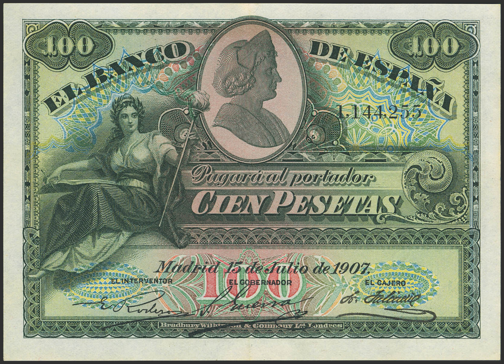 100 Pesetas. 15 de Julio de 1907. Sin serie. (Edifil 2023: 320). Conserva parte de su apresto original. EBC.