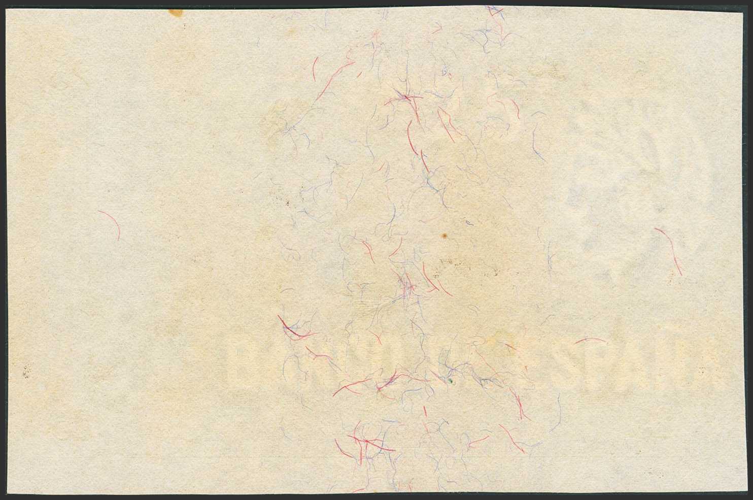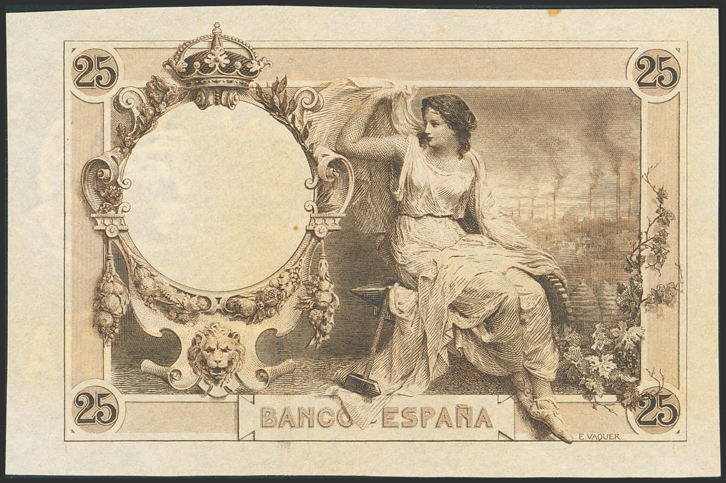 Prueba del reverso en color castaño-sepia del billete no emitido de 25 Pesetas del 1 de Diciembre de 1908. (Edifil 2023: NE14Pb). SC-.