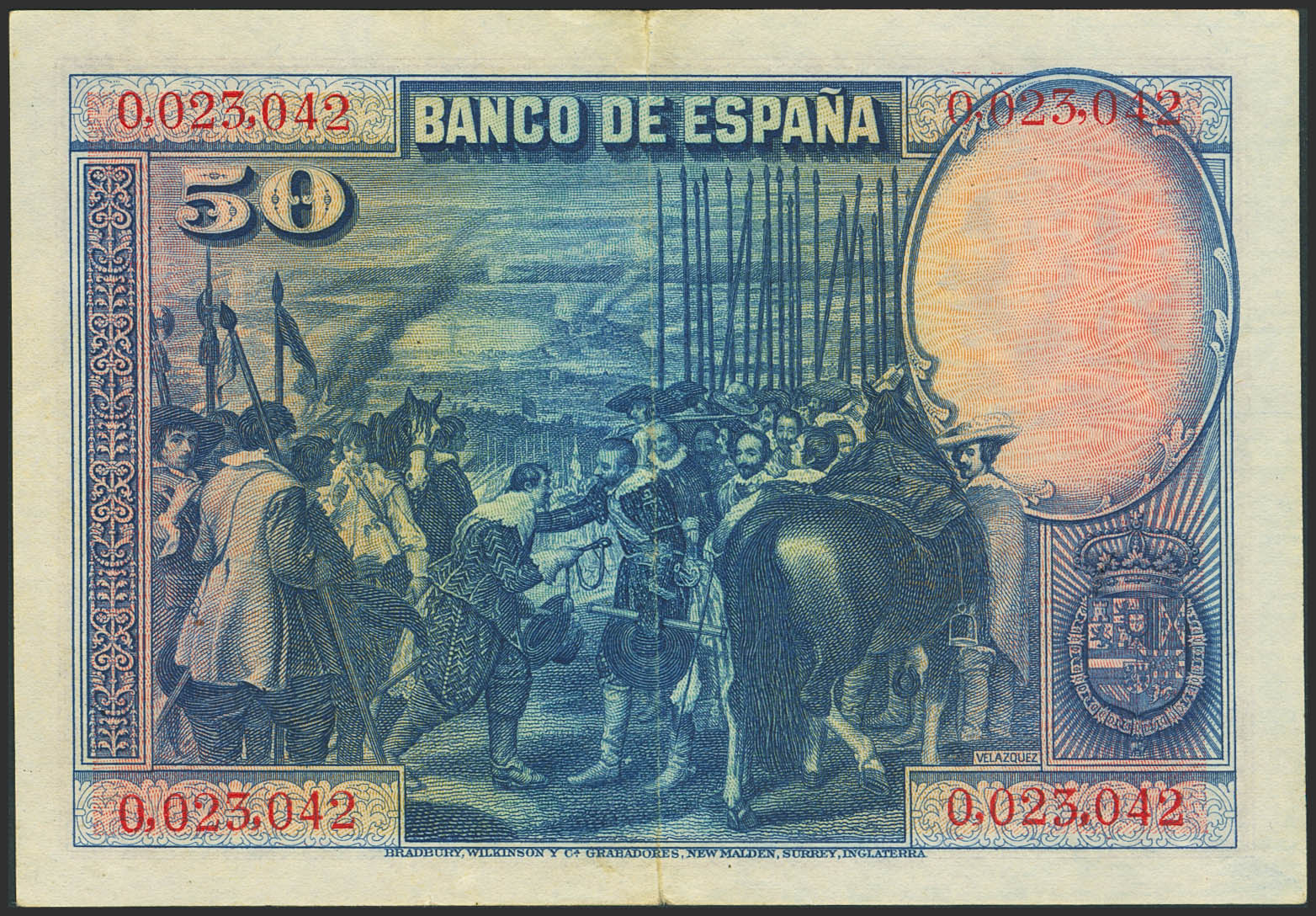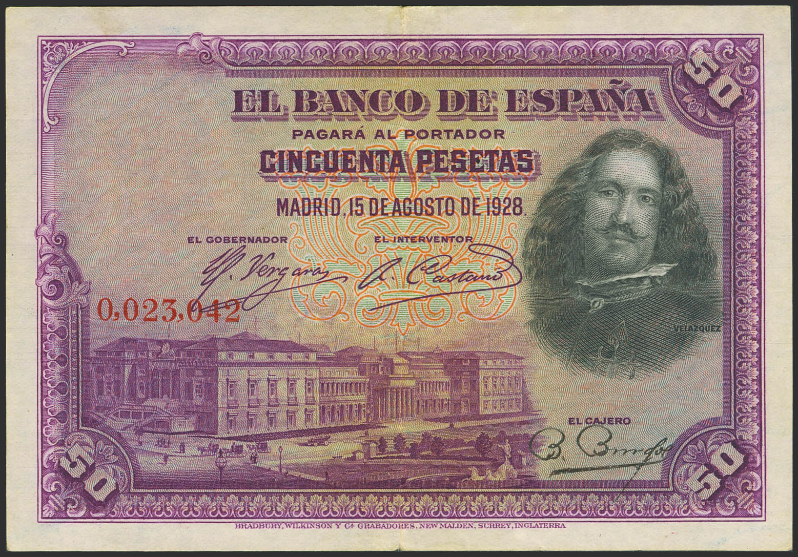 50 Pesetas. 15 de Agosto de 1928. Sin serie y numeración bajísima. (Edifil 2023: 329). Inusual. EBC-.