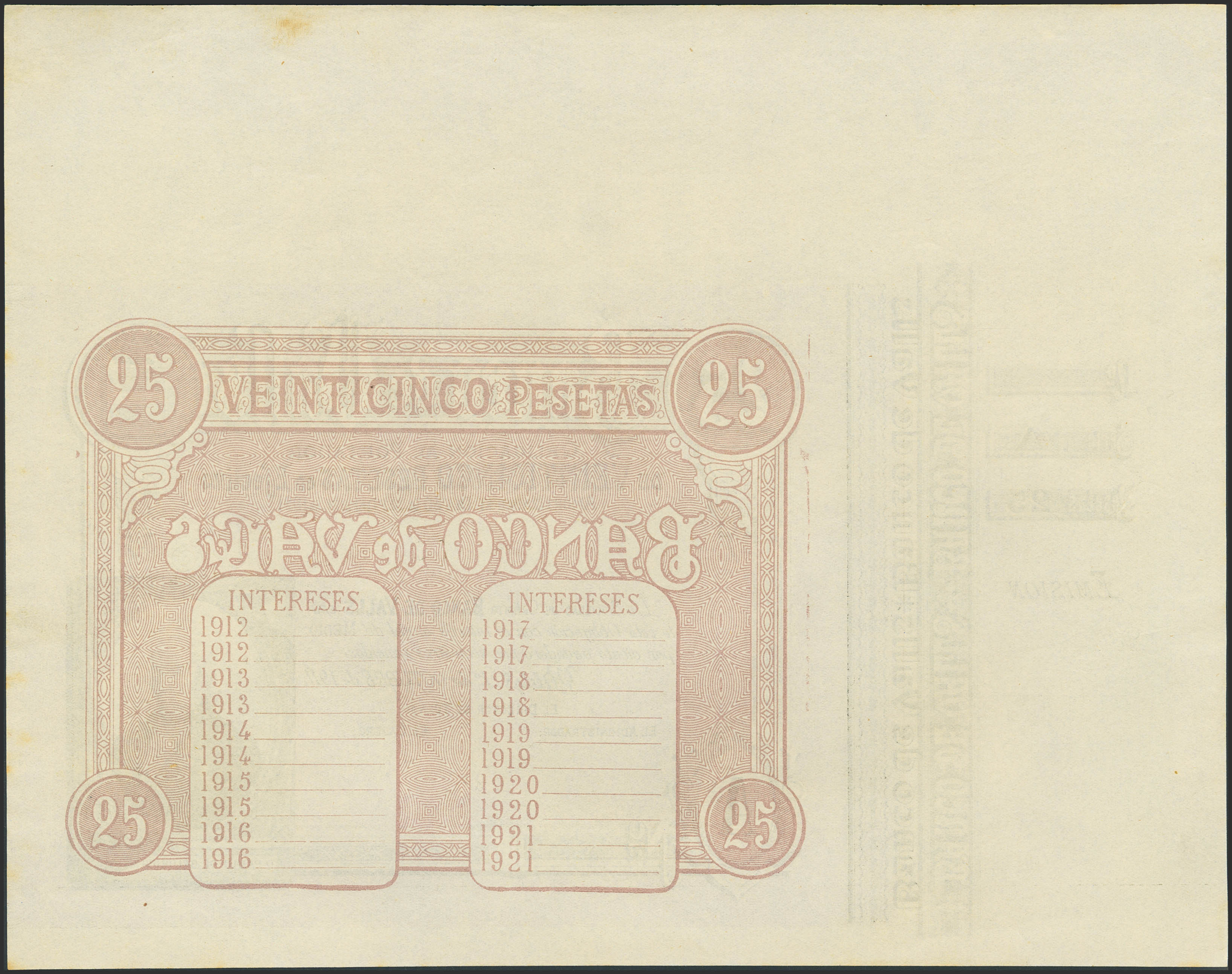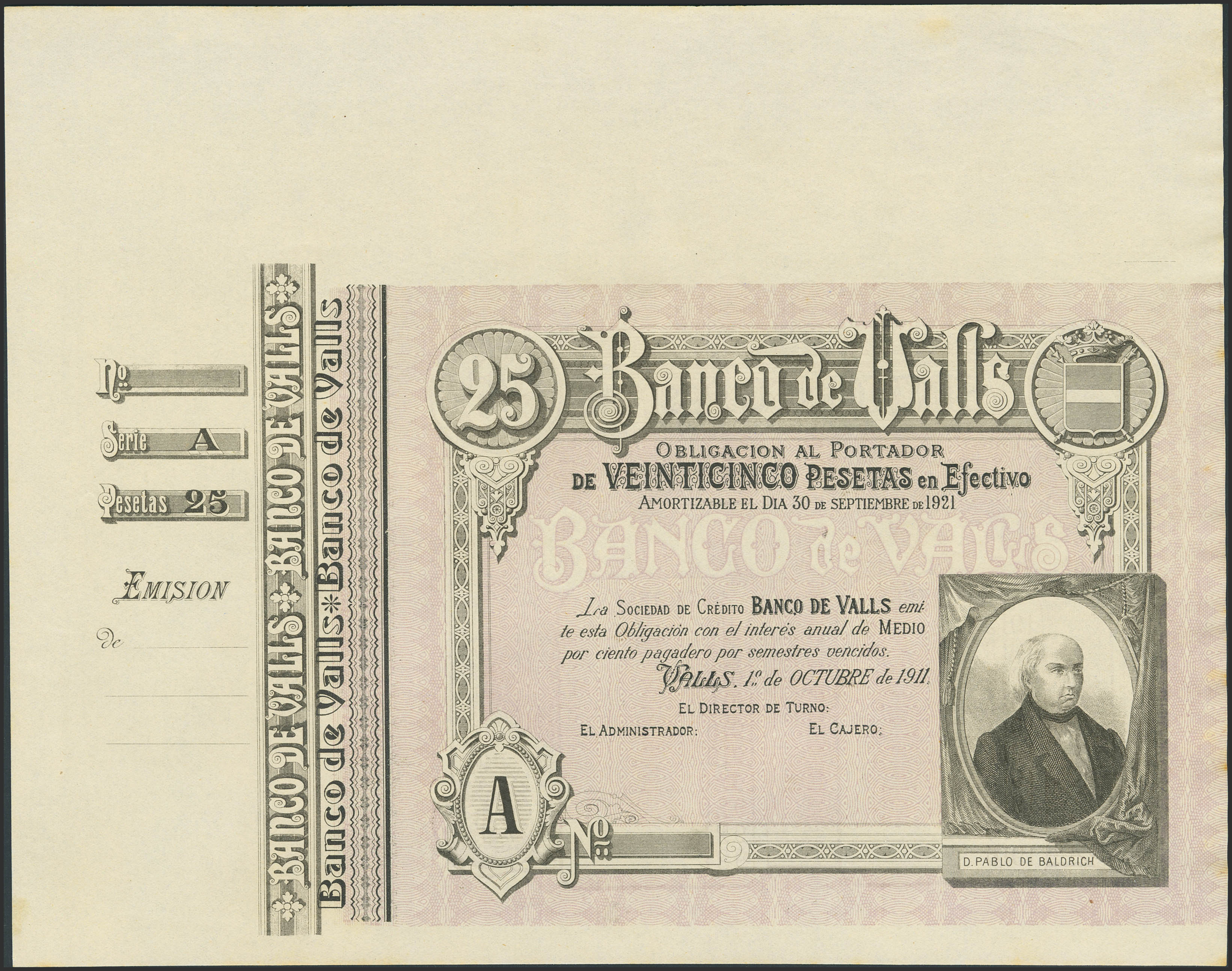25 Pesetas. 1 de Julio de 1911. Banco de Valls. Serie A, sin numeración, sin firmas y con matriz. (Ruiz y Alentorn: no listado). SC-.