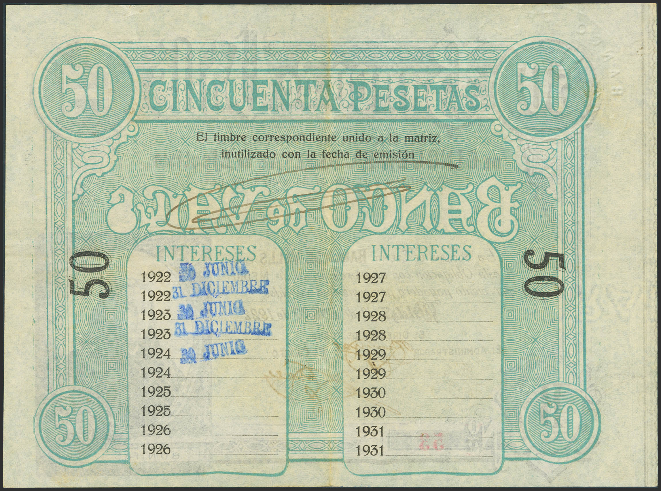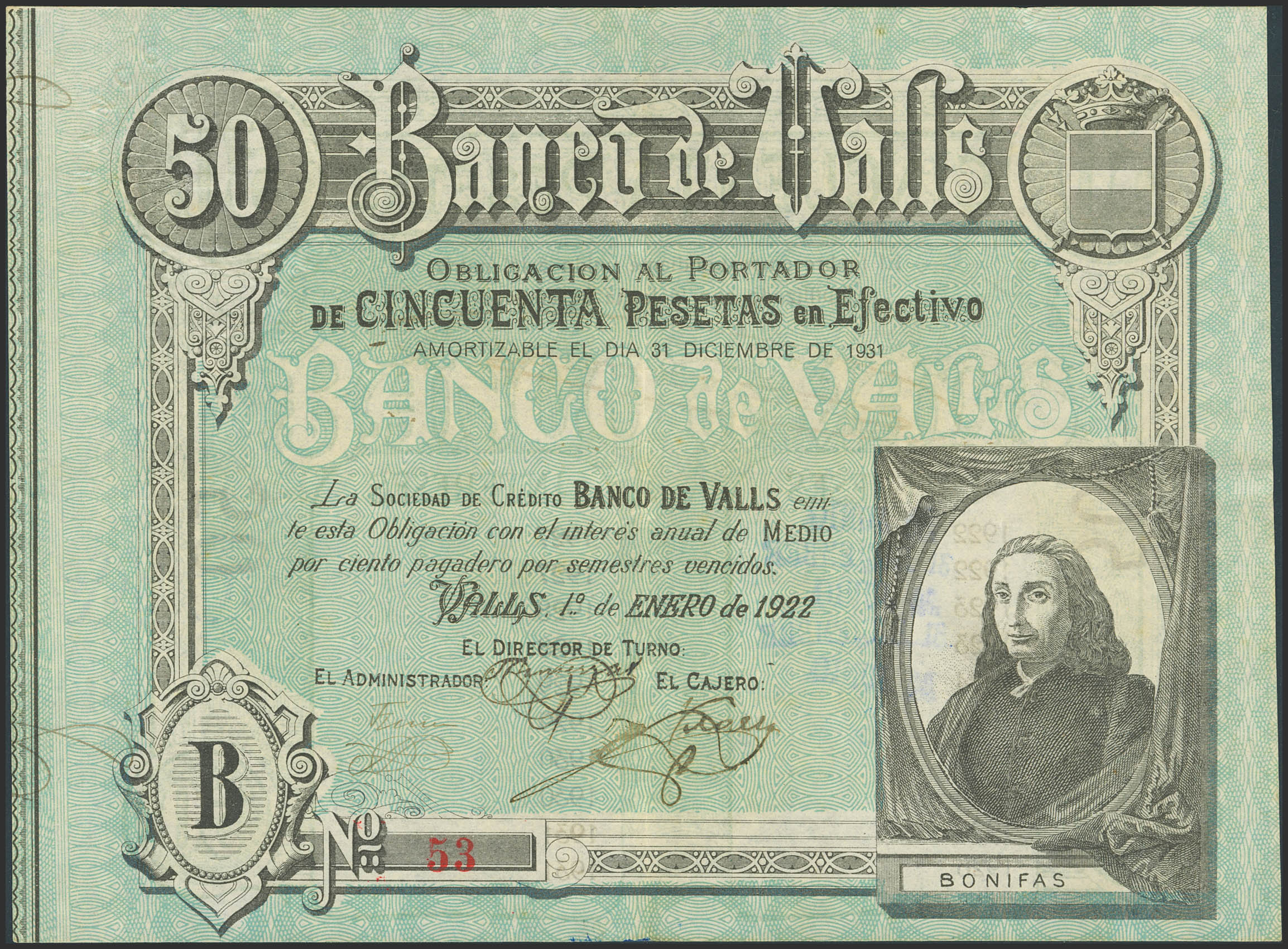 50 Pesetas. 1 de Enero de 1922. Banco de Valls. Serie B, con numeración 53 y firmas originales. (Ruiz y Alentorn: 931). Rarísimo circulado. MBC+.