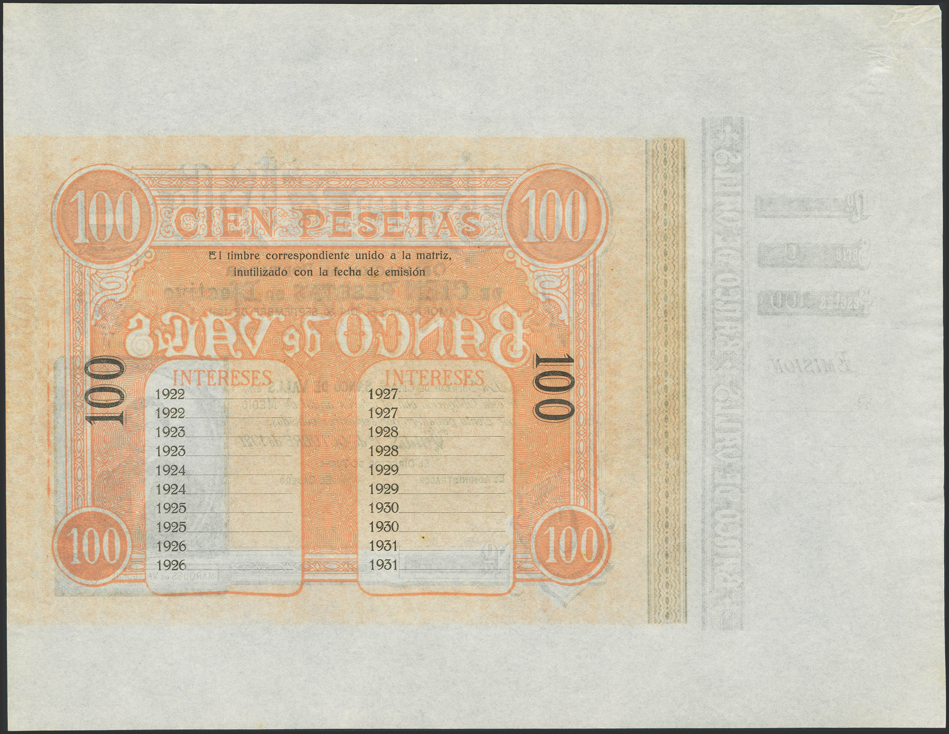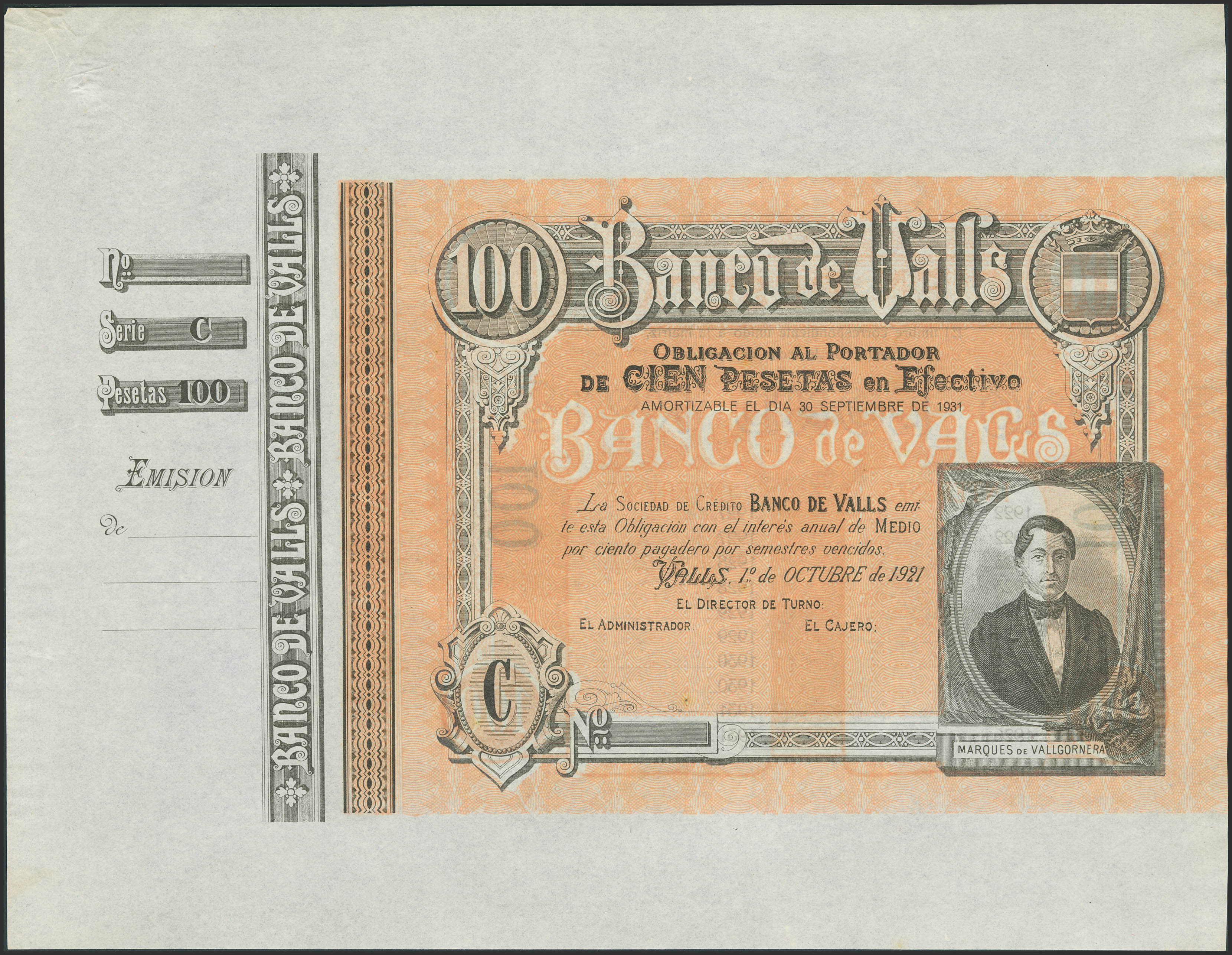 100 Pesetas. 1 de Enero de 1922. Banco de Valls. Serie C, sin numeración, sin firmas y con matriz. (Ruiz y Alentorn: no listado). SC-.