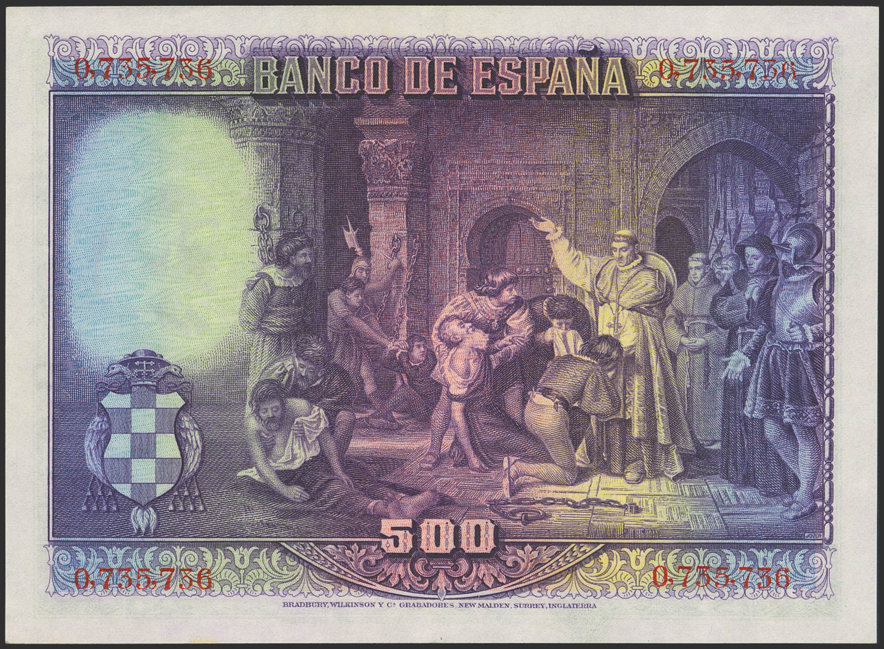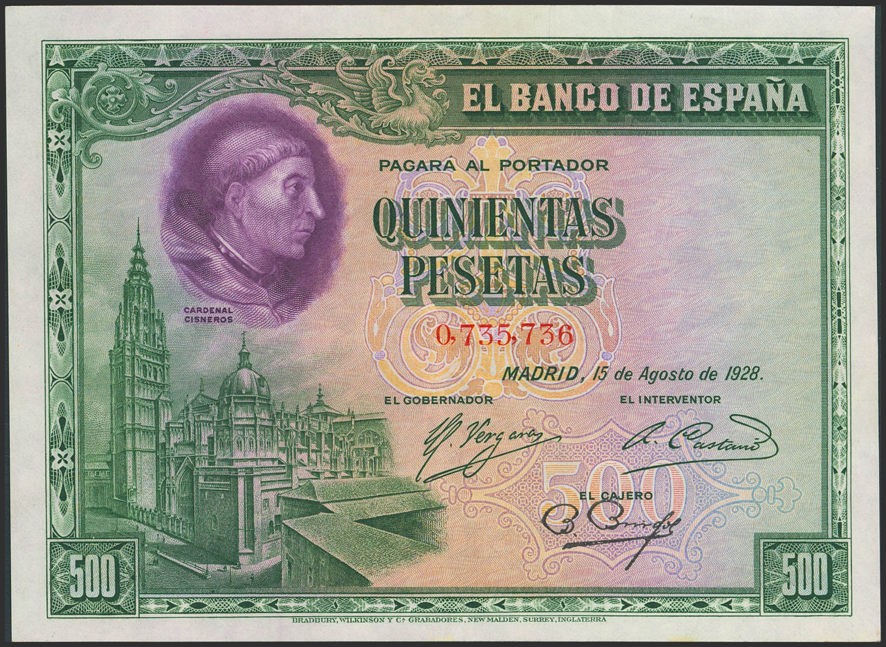 500 Pesetas. 15 de Agosto de 1928. Sin serie. (Edifil 2023: 356). Conserva gran parte de su apresto original. EBC+++.