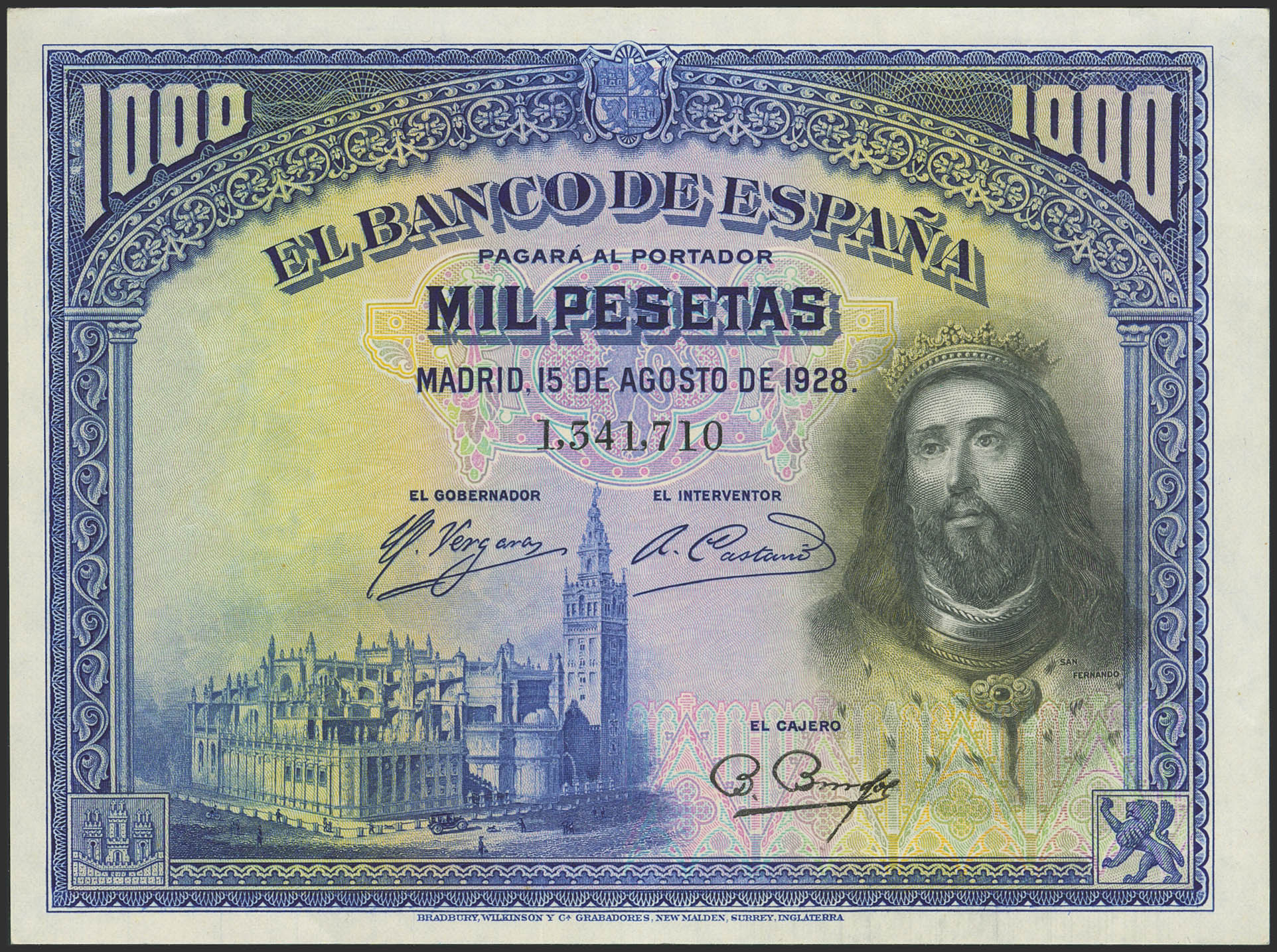 1000 Pesetas. 15 de Agosto de 1928. Sin serie. (Edifil 2023: 357). Conserva gran parte de su apresto original. EBC-.