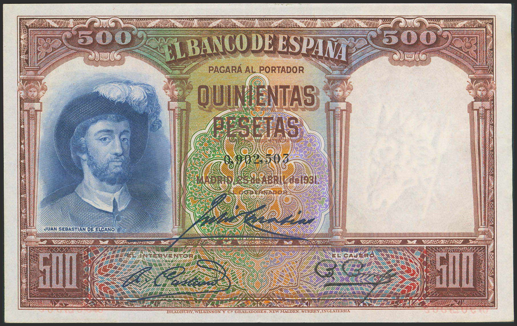 500 Pesetas. 25 de Abril de 1931. Sin serie. (Edifil 2023: 361). Conserva gran parte del apresto original. SC-.