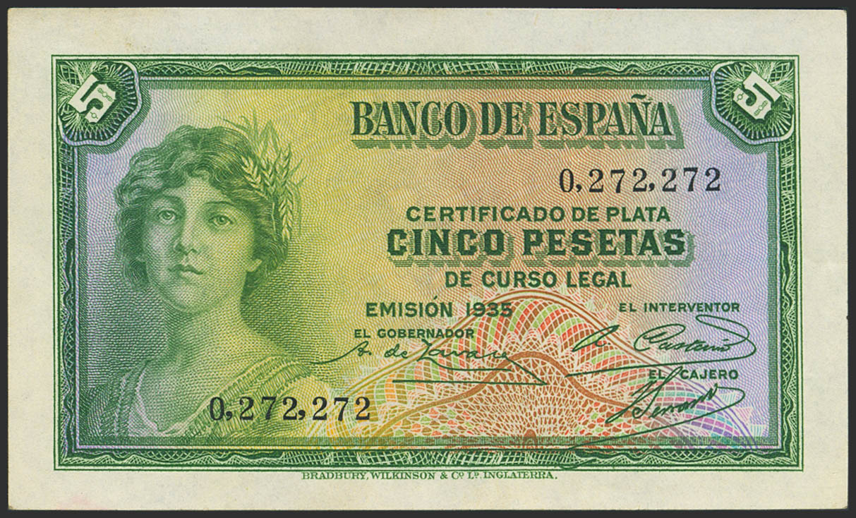 5 Pesetas. 1935. Certificado de Plata. Sin serie y capicúa imperfecto. (Edifil 2023: 363). Conserva parte de su apresto original. EBC.