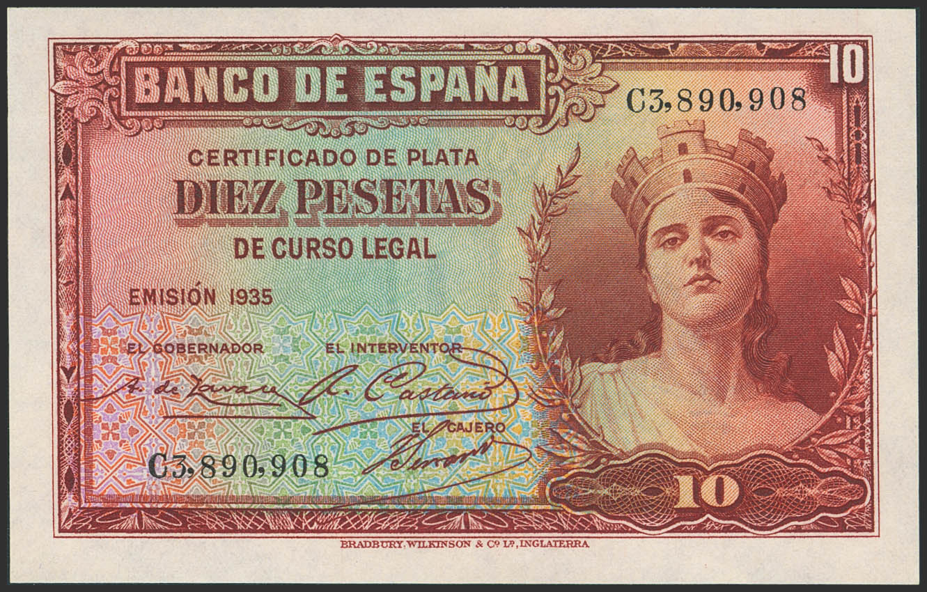 10 Pesetas. 1935. Certificado de Plata. Serie C, última serie emitida. (Edifil 2023: 364b). Conserva todo su apresto original. SC.