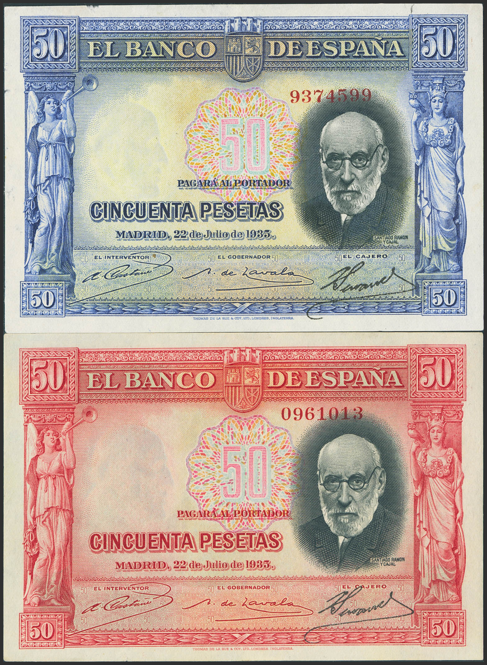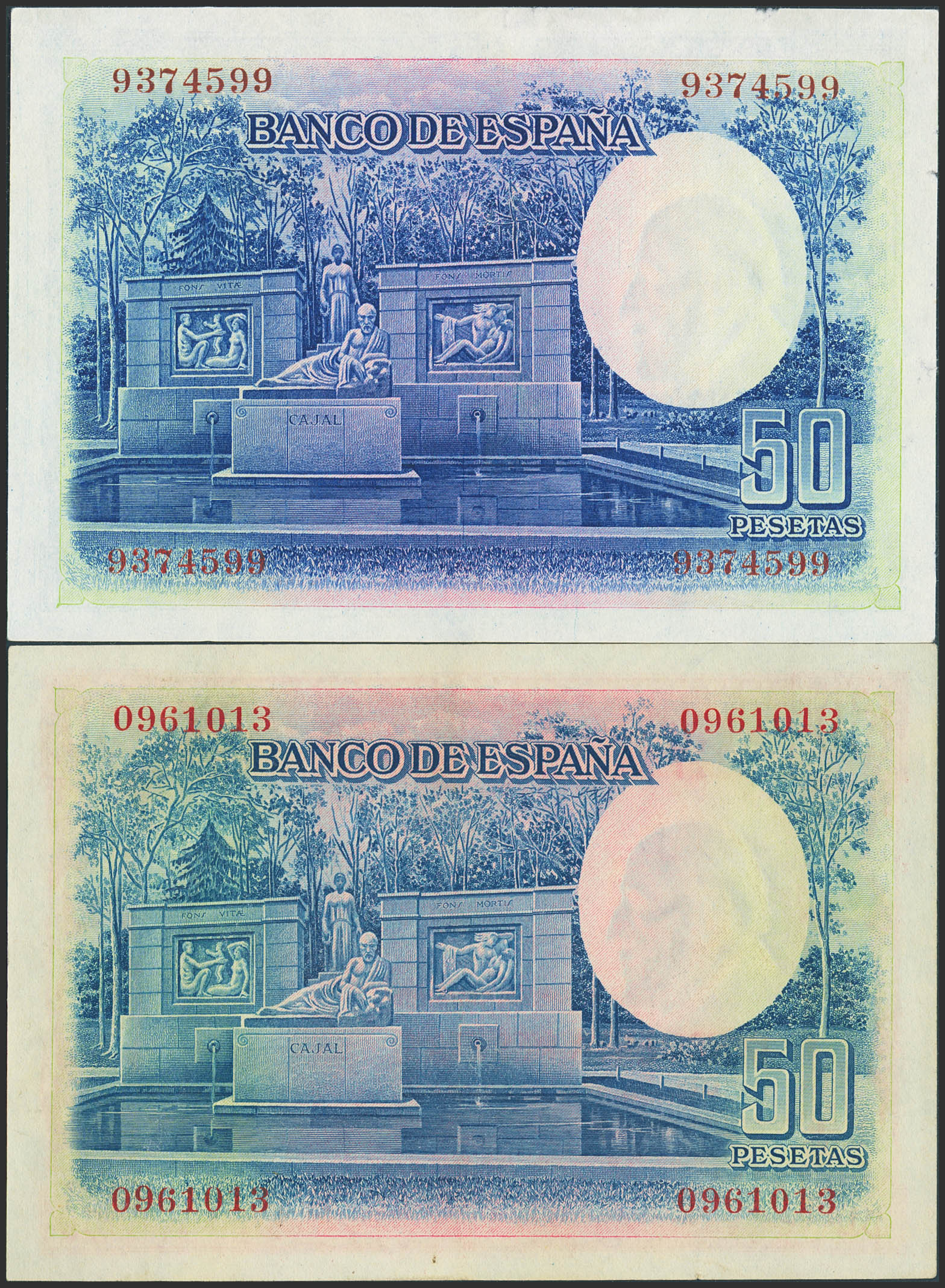 Conjunto de 2 billetes de 50 Pesetas emitidos el 22 de Julio de 1935 y sin serie, ambos alterados químicamente. (Edifil 2023: 366). A EXAMINAR.