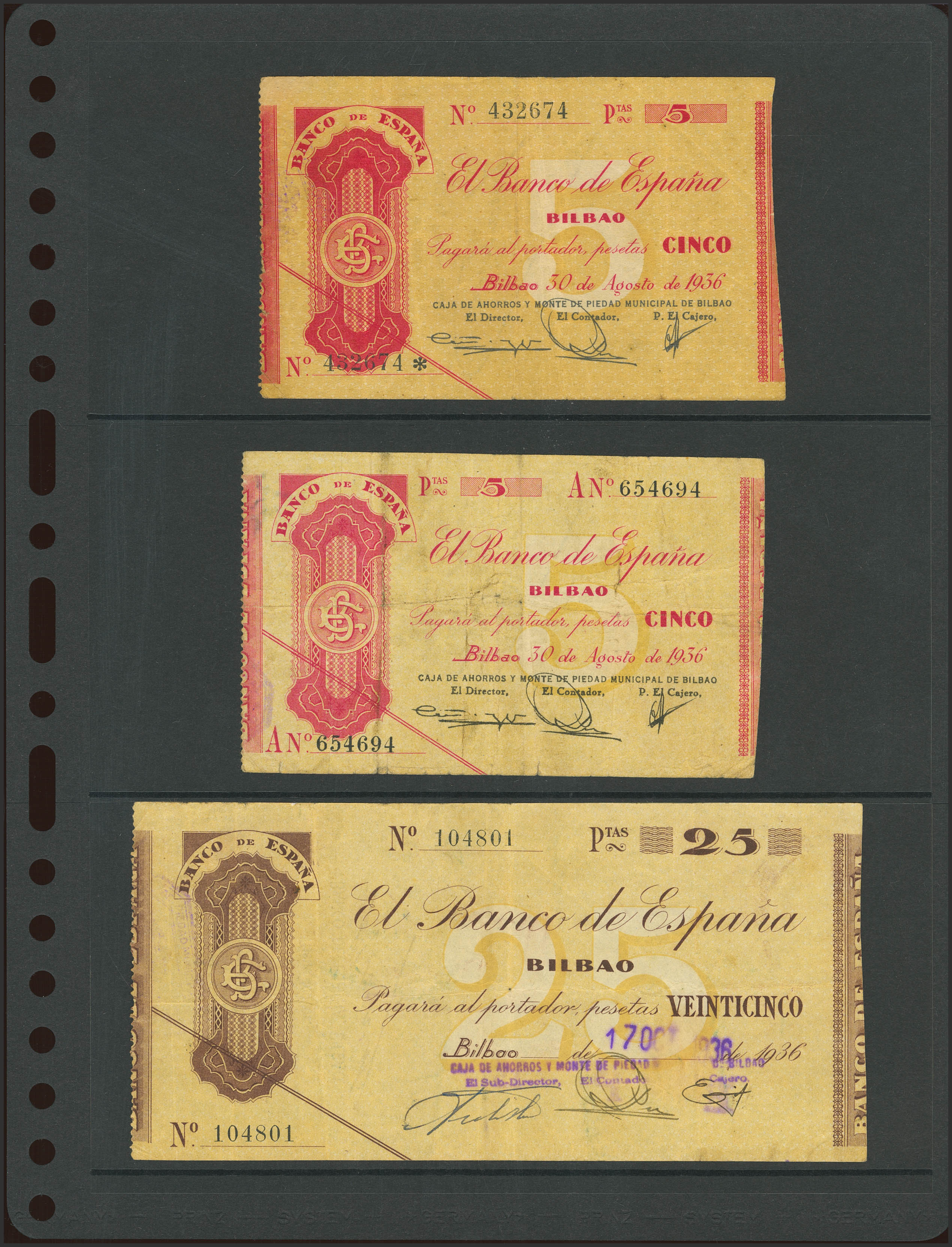 Serie completa de 5 billetes del Banco de Bilbao, emitidos en 1936 incluyendo el 5 Pesetas (sin serie y serie A), 25 Pesetas, 50 Pesetas y 100 Pesetas, con la antefirma Caja de Ahorros y Monte de Piedad Municipal de Bilbao. (Edifil 2023: 368/71b, 368Ab). MBC-/BC+.