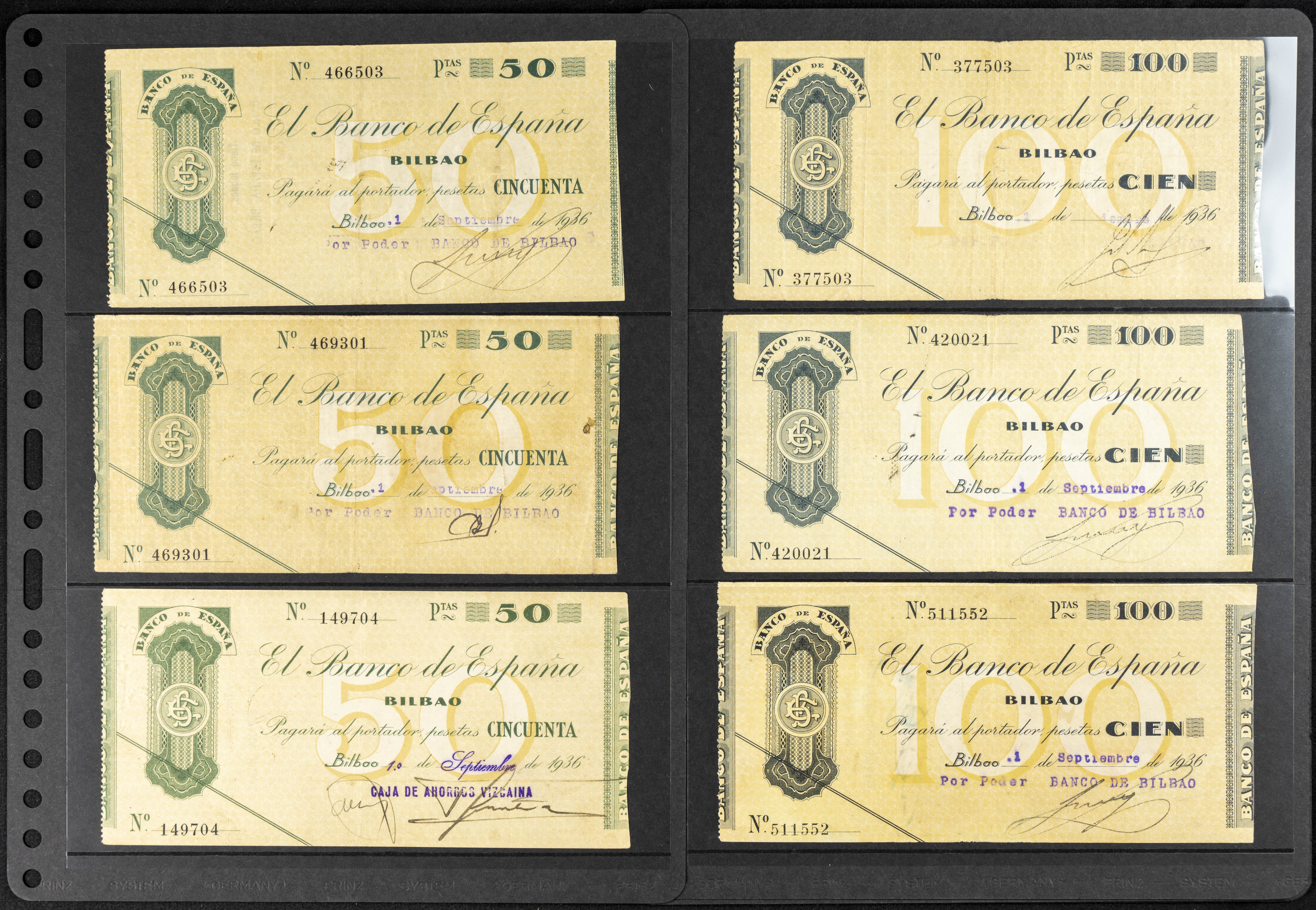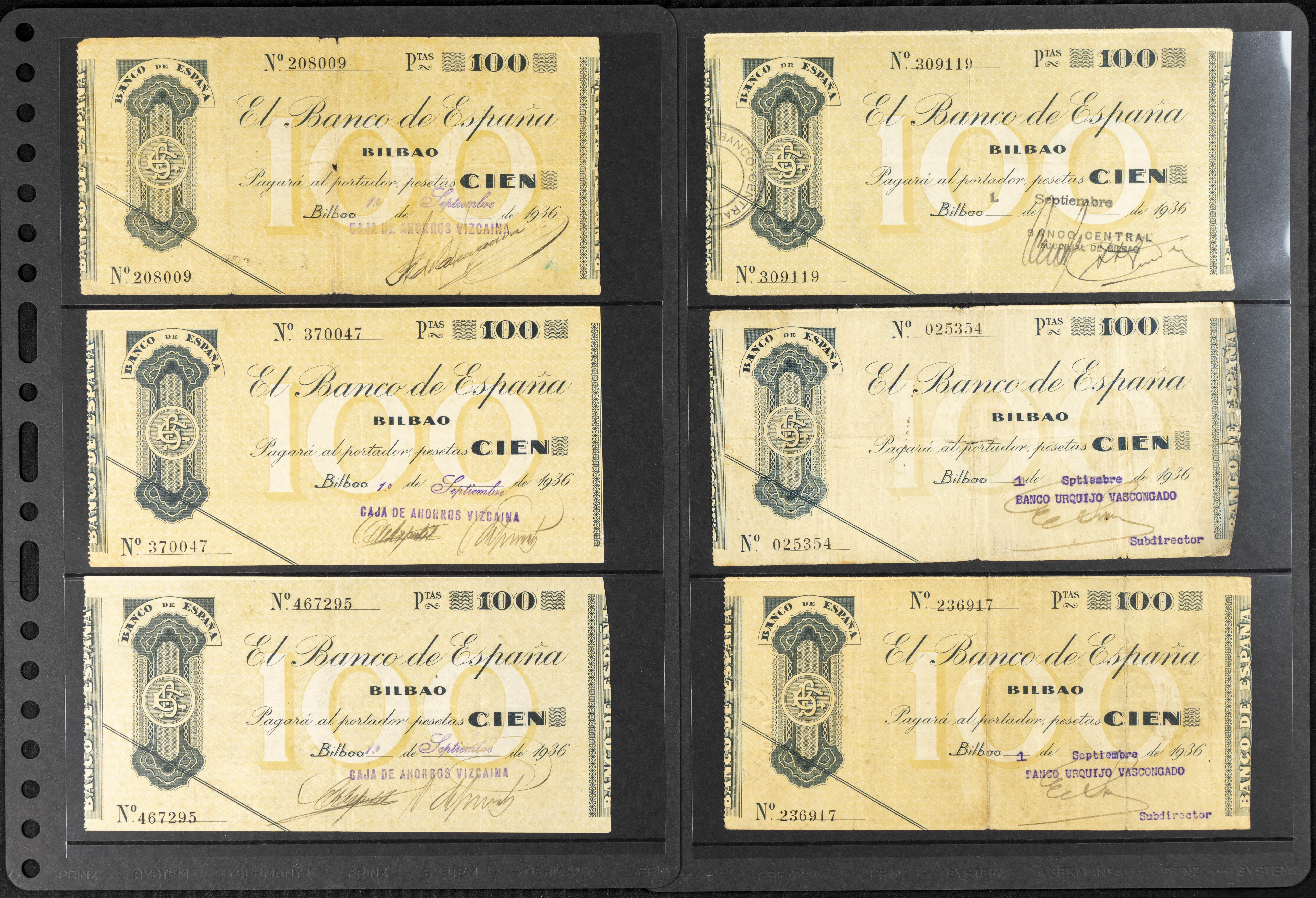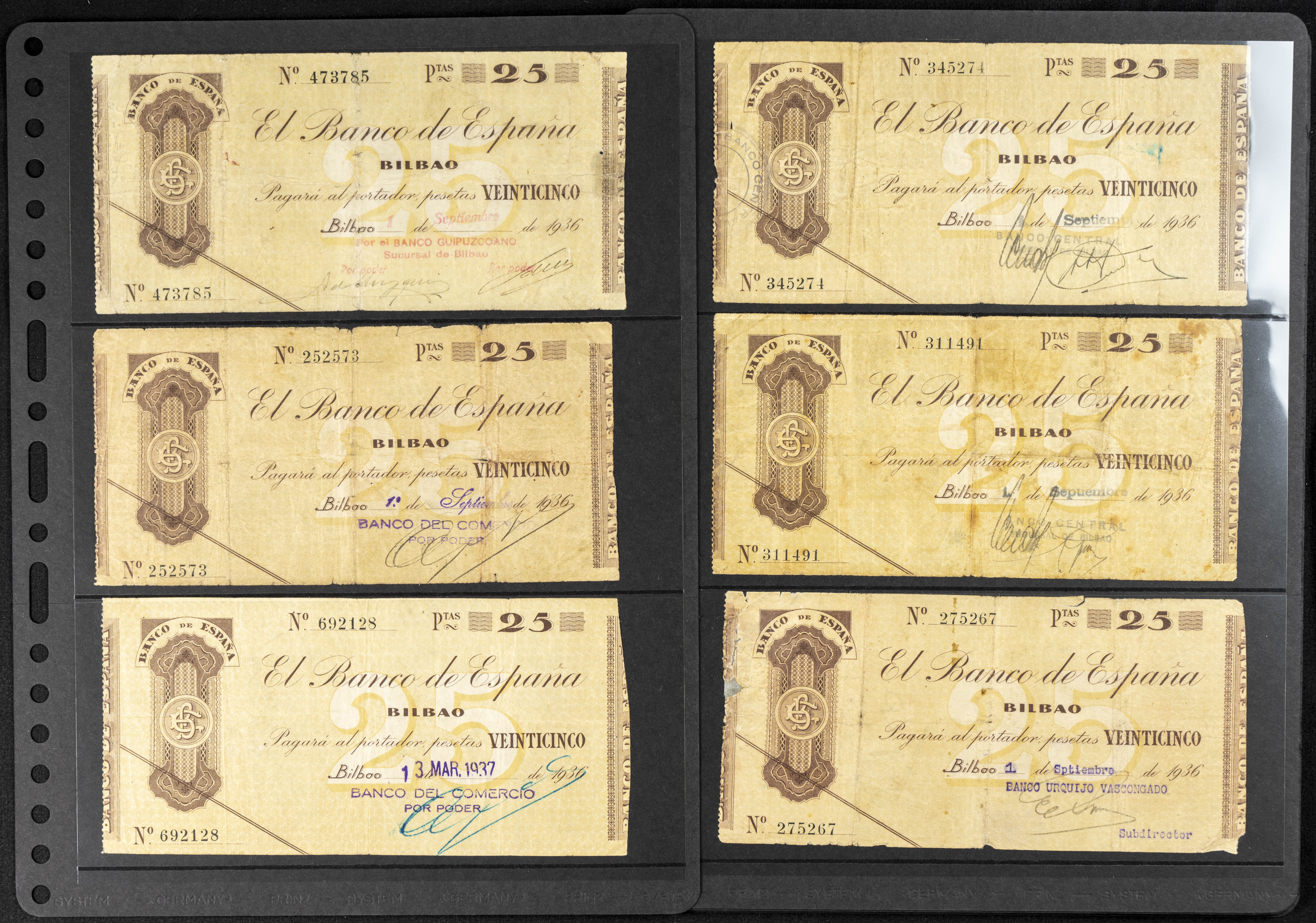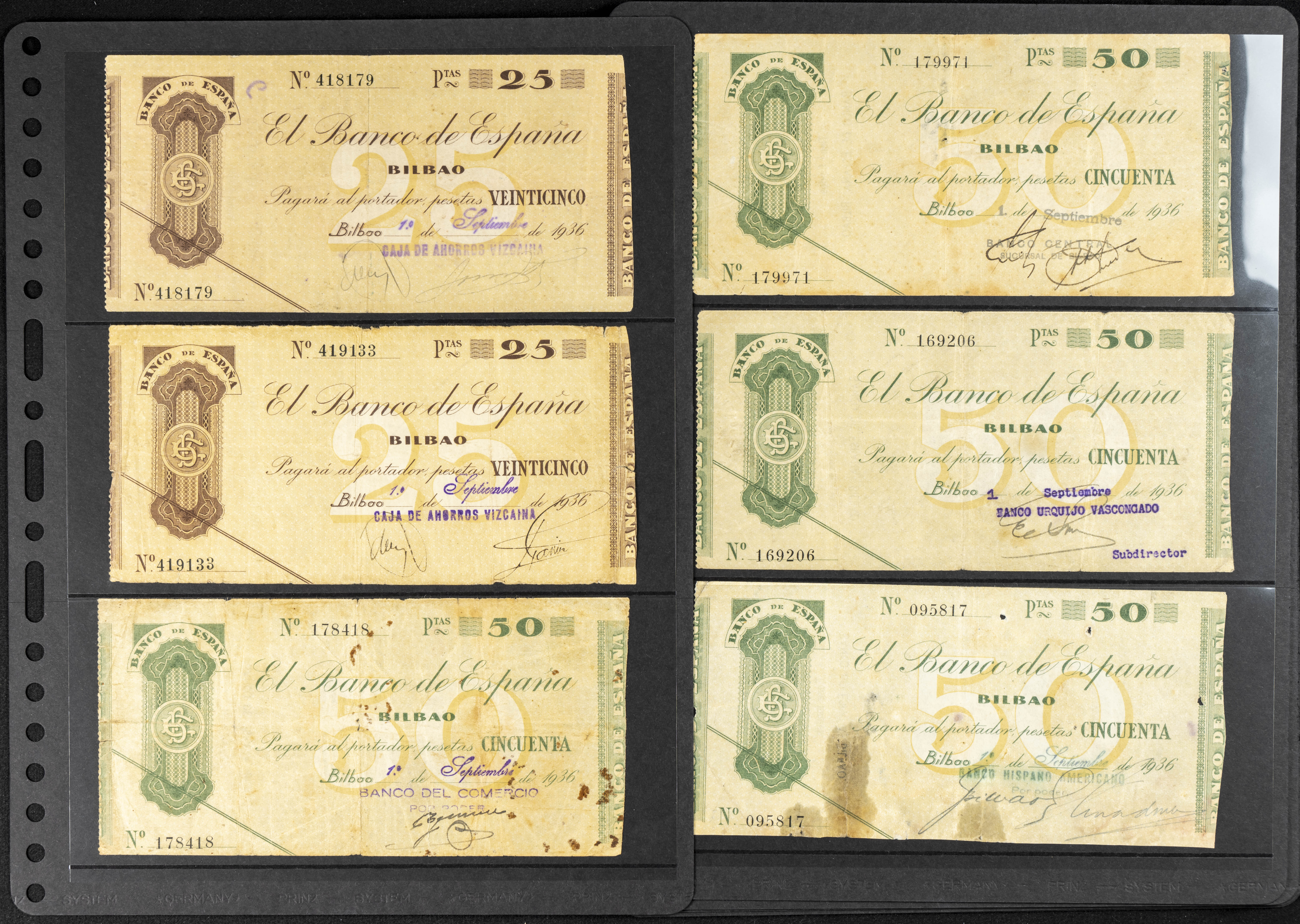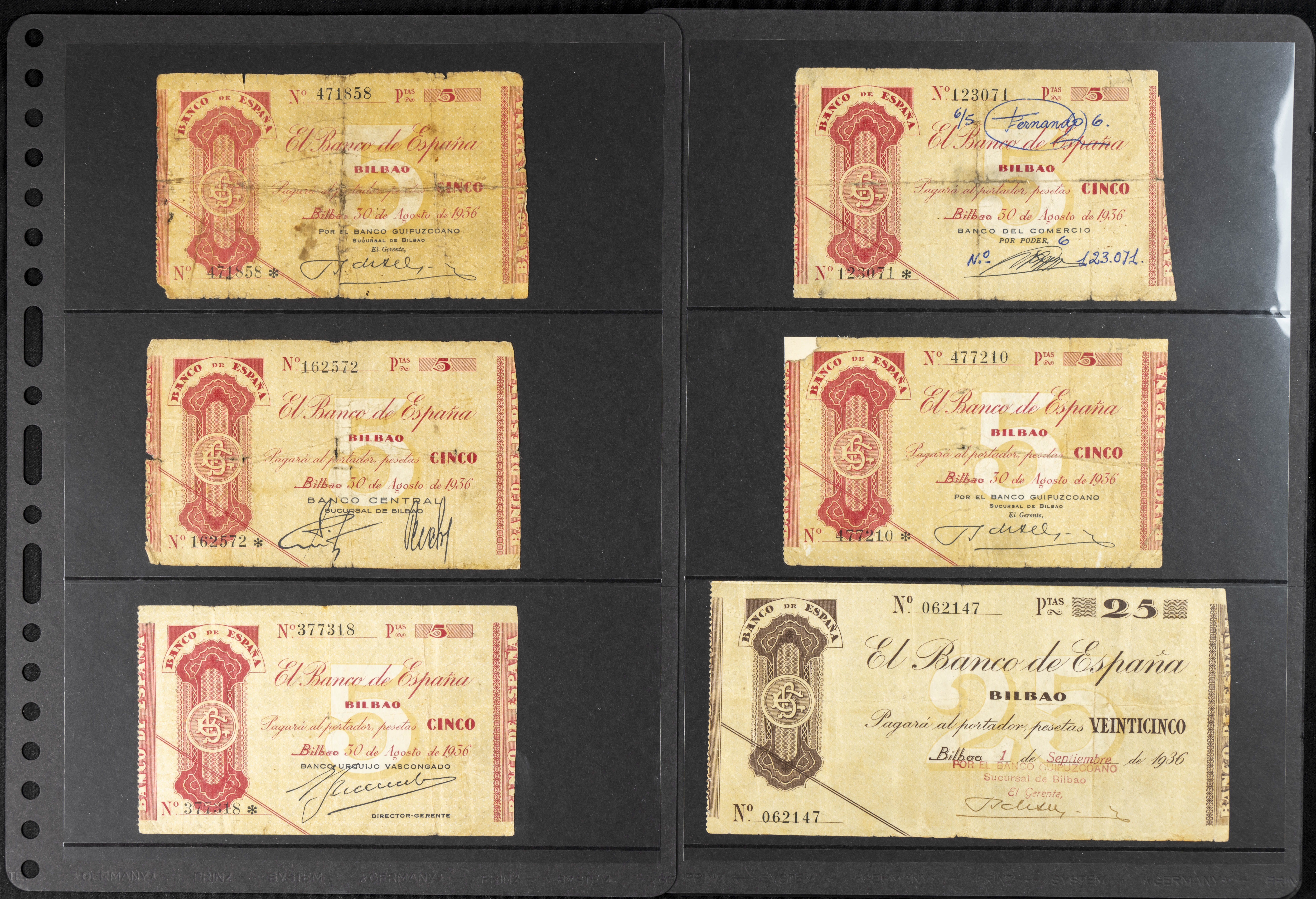 Conjunto de más de 25 billetes de diferentes denominaciones del Banco de Bilbao, emitidos en 1936, con diferentes antefirmas y en diversas calidades. A EXAMINAR.
