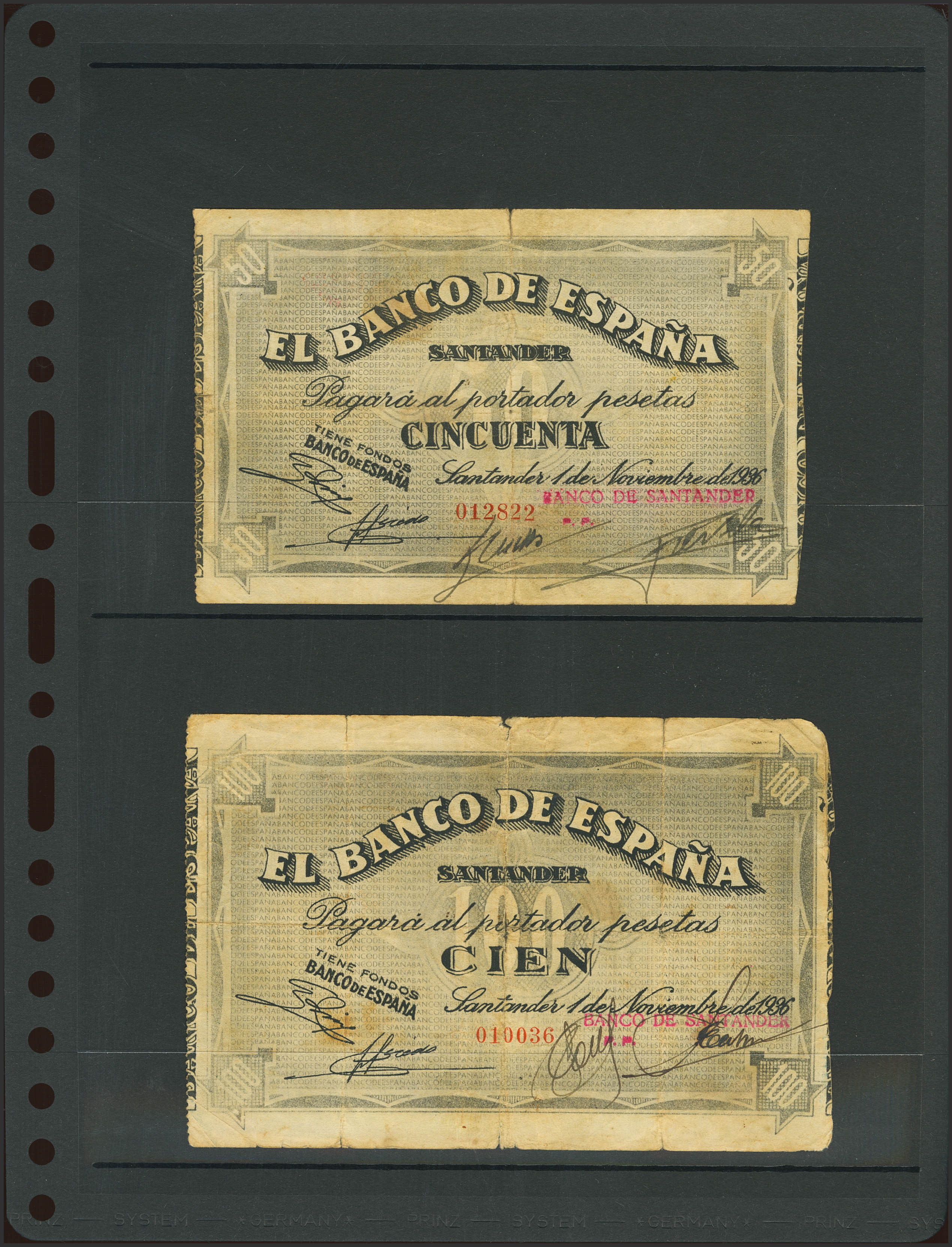 Serie de 5 billetes del Banco de España de la sucursal de Santander correspondientes a los valores de 5 Pesetas, 10 Pesetas, 25 Pesetas, 50 Pesetas y 100 Pesetas, emitidos el 1 de Noviembre de 1936, todos ellos sin serie y con la antefirma Banco de Santander. (Edifil 2023: 375/79g). MBC.