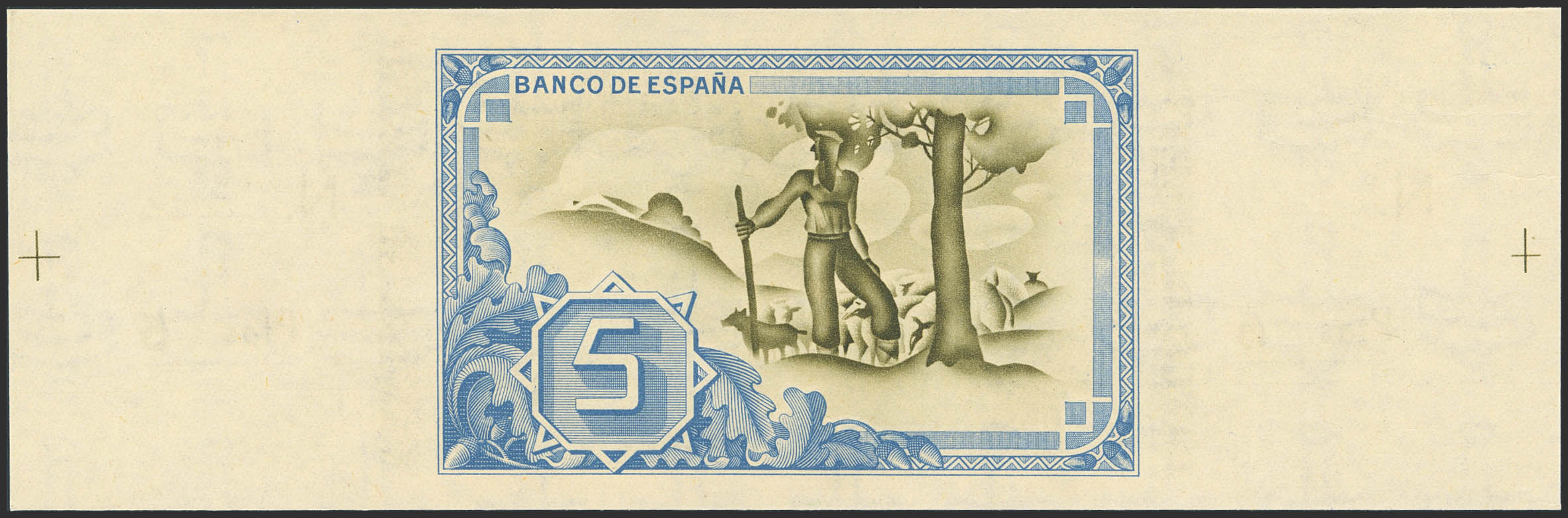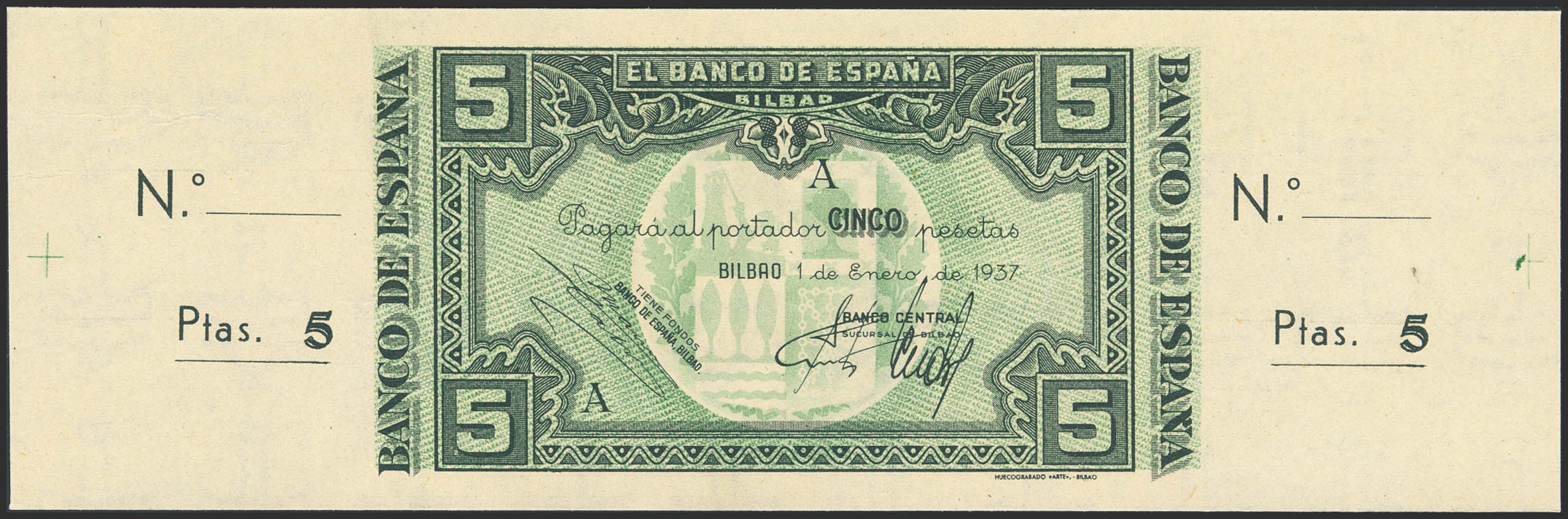 5 Pesetas. 1 de Enero de 1937. Sucursal de Bilbao, antefirma Banco Central. Serie A y sin numeración, con ambas matrices. (Edifil 2023: 386b). Apresto original. SC.