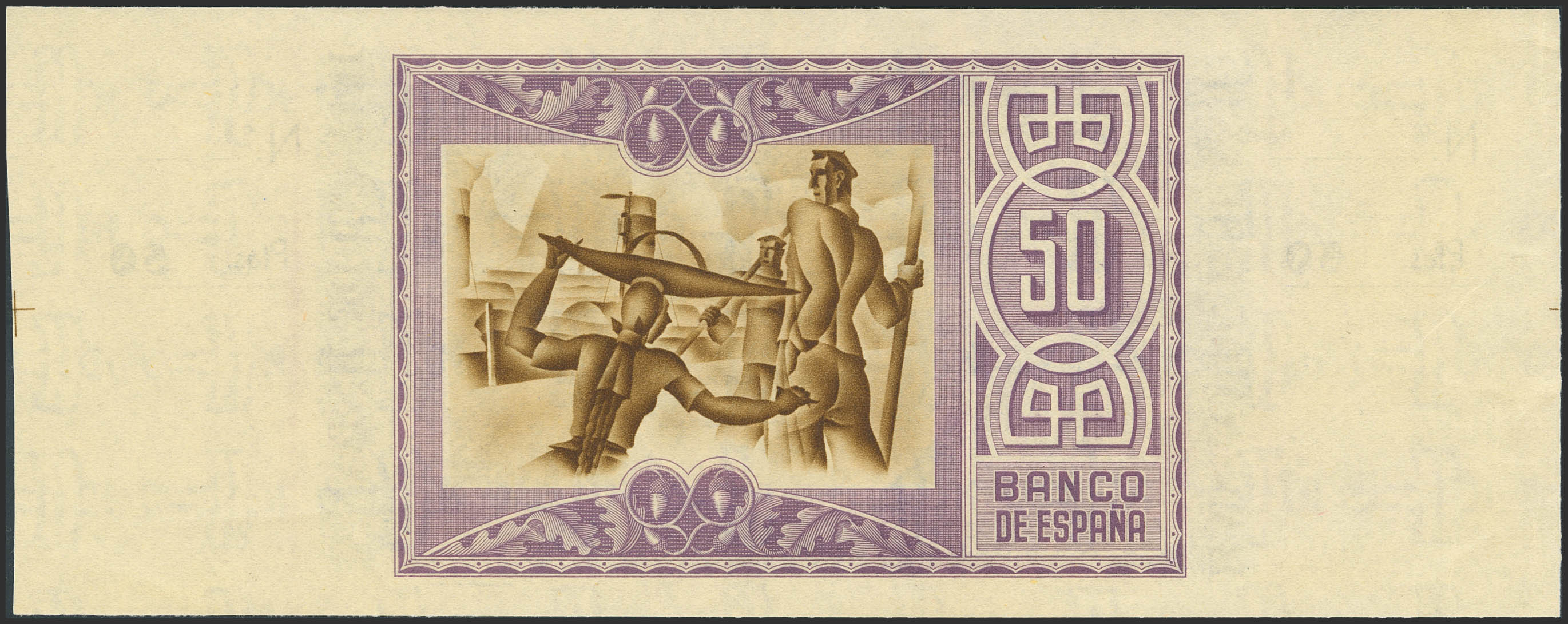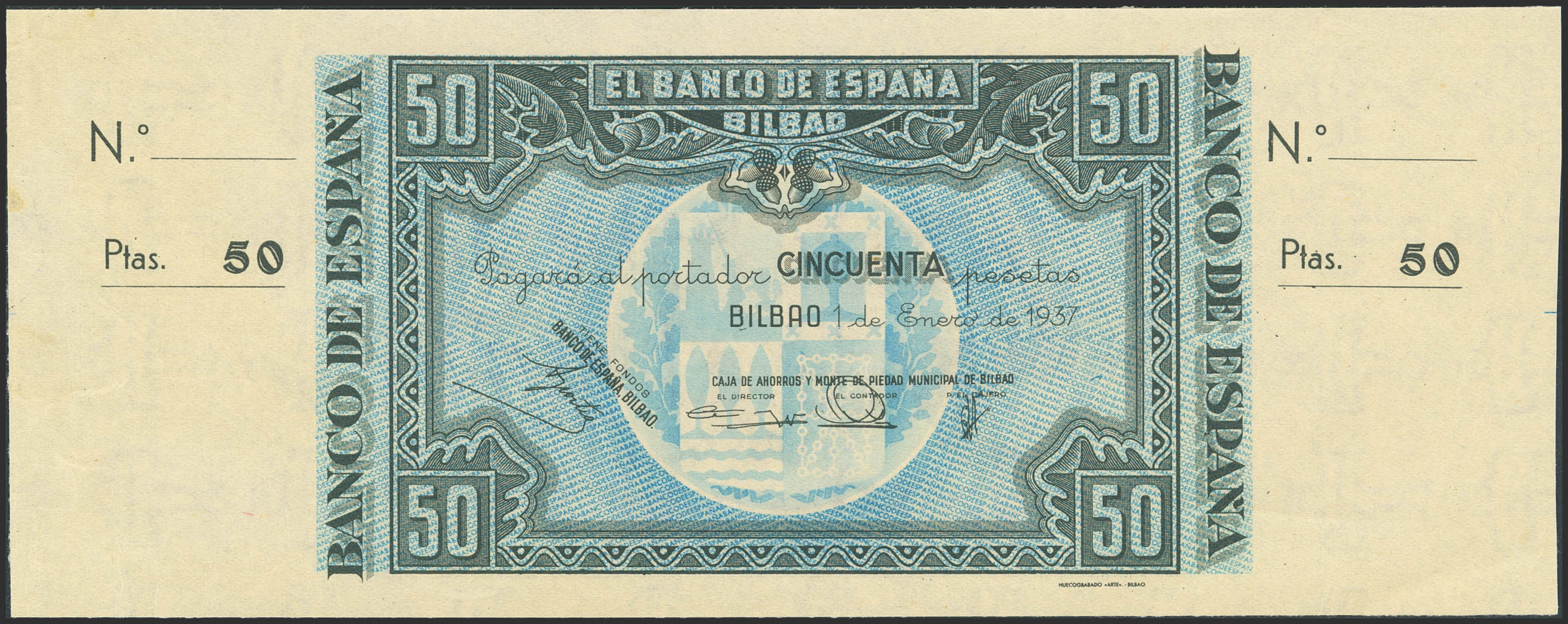 50 Pesetas. 1 de Enero de 1937. Sucursal de Bilbao, antefirma Caja de Ahorros y Monte de Piedad Municipal de Bilbao. Sin serie y sin numeración, con ambas matrices. (Edifil 2023: 389c). SC--.