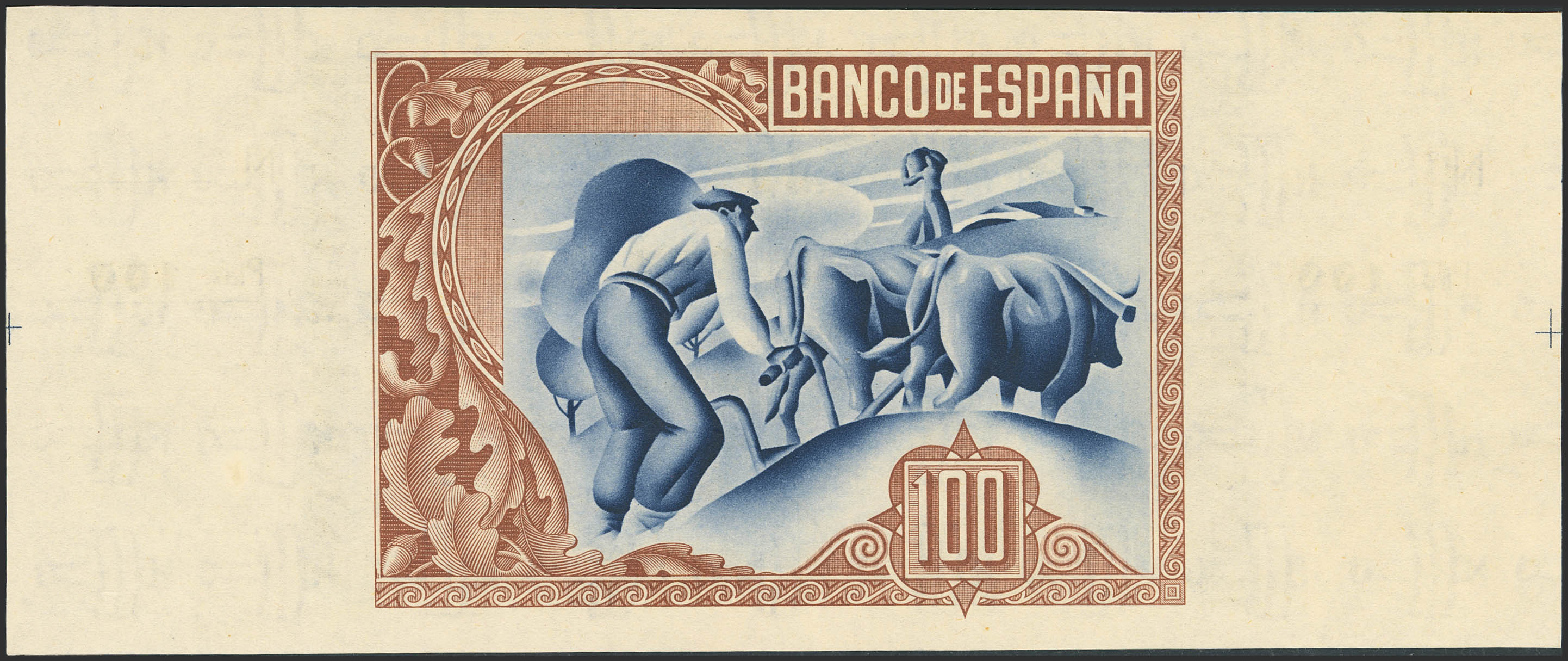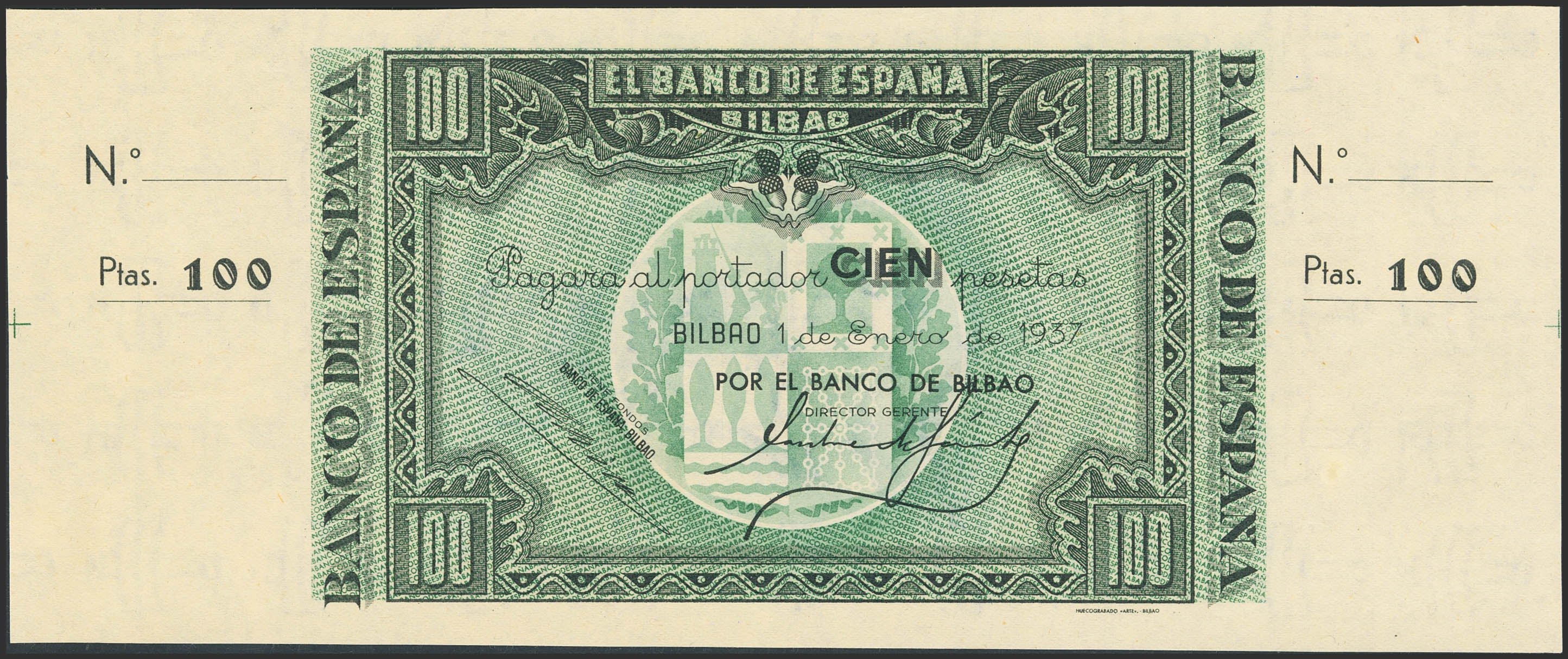 100 Pesetas. 1 de Enero de 1937. Sucursal de Bilbao, antefirma Banco de Bilbao. Sin serie y sin numeración, con ambas matrices. (Edifil 2023: 390a). Apresto original. SC-.