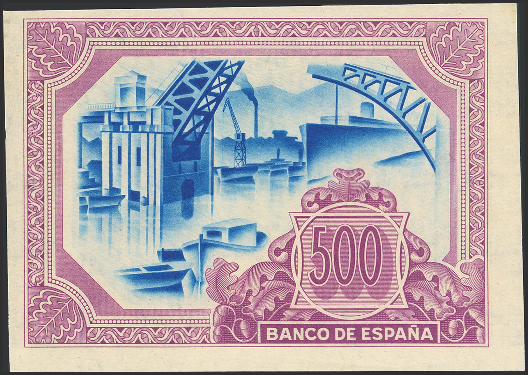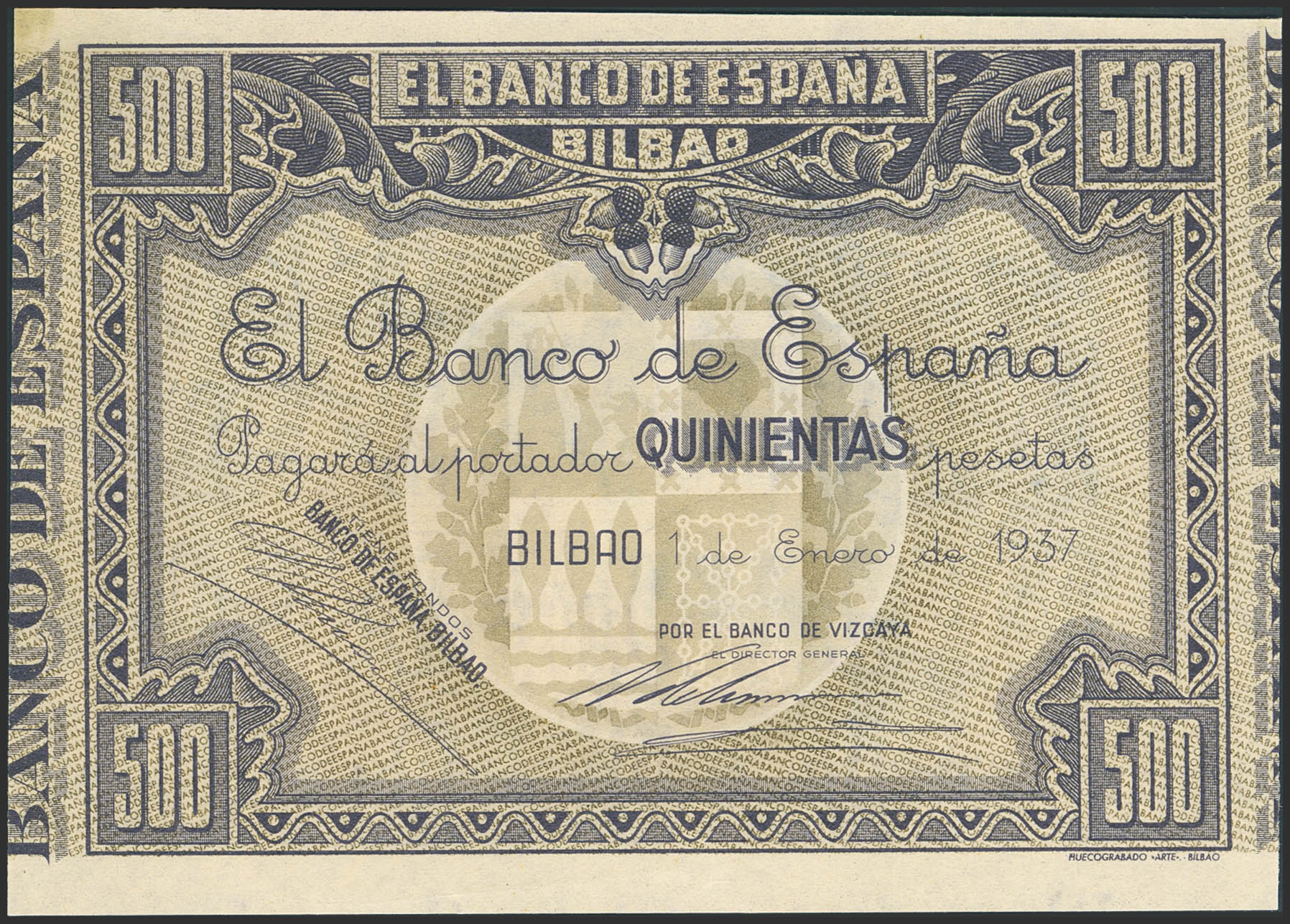 500 Pesetas. 1 de Enero de 1937. Sucursal de Bilbao, antefirma Banco de Vizcaya. Sin serie y sin numeración, sin matrices. (Edifil 2023: NE26g). Raro. EBC+++.